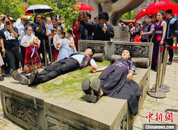 婚礼现场一对新人手牵手躺在“双胞床”上祈福。