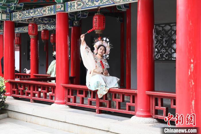 身着传统服饰的游客在滕王阁景区内拍照。中新网