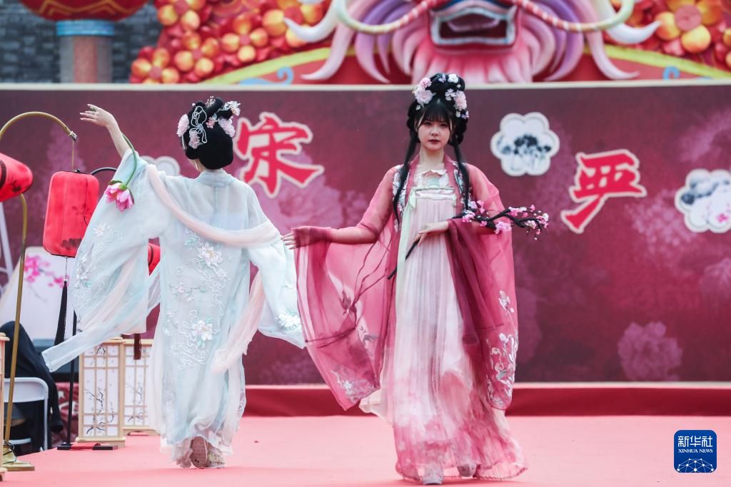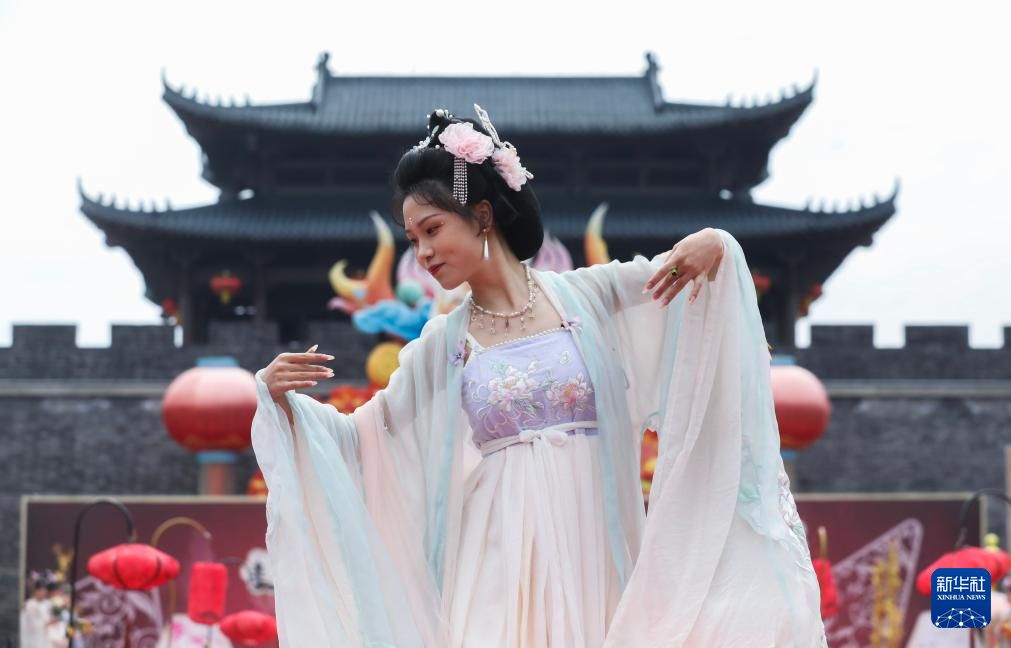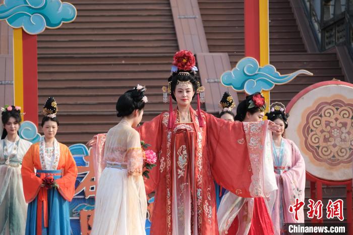 5月1日,隋唐洛阳城应天门前上演《簪花迎远客》古装演艺。中新网