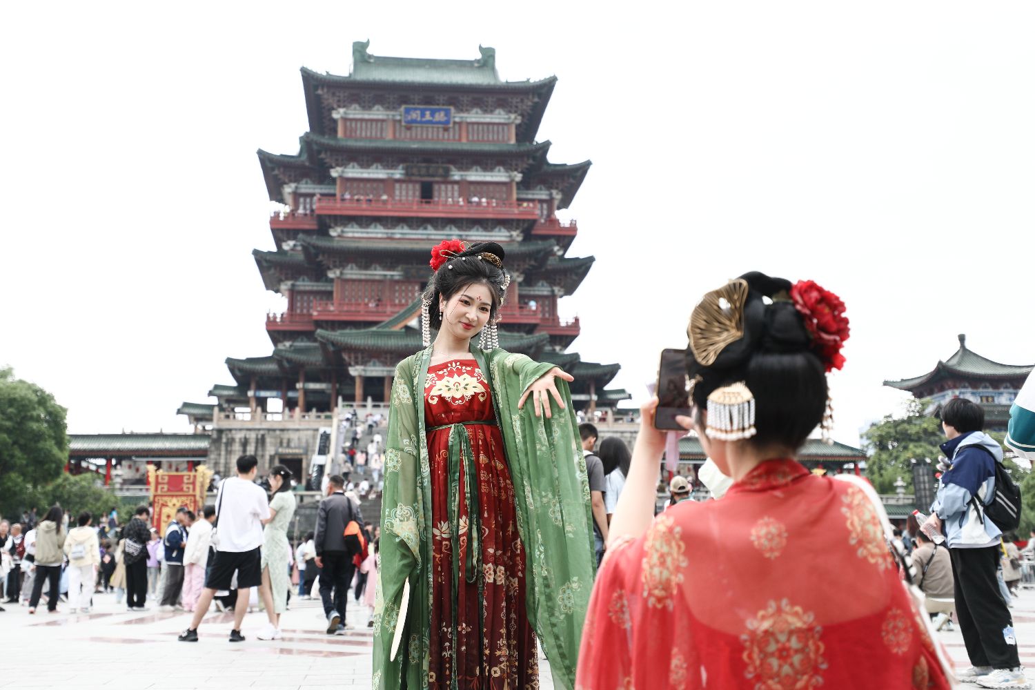 中国五一假期期间,全国多地举办活动,其中古装演艺活动吸引游客目光,除此之外,游客也会自行穿着传统古装服饰在景区拍照留念。图为5月1日,位于江西南昌的“江南名楼”滕王阁吸引众多游客参观。一名身着传统服饰的游客在滕王阁景区内拍照。中新社