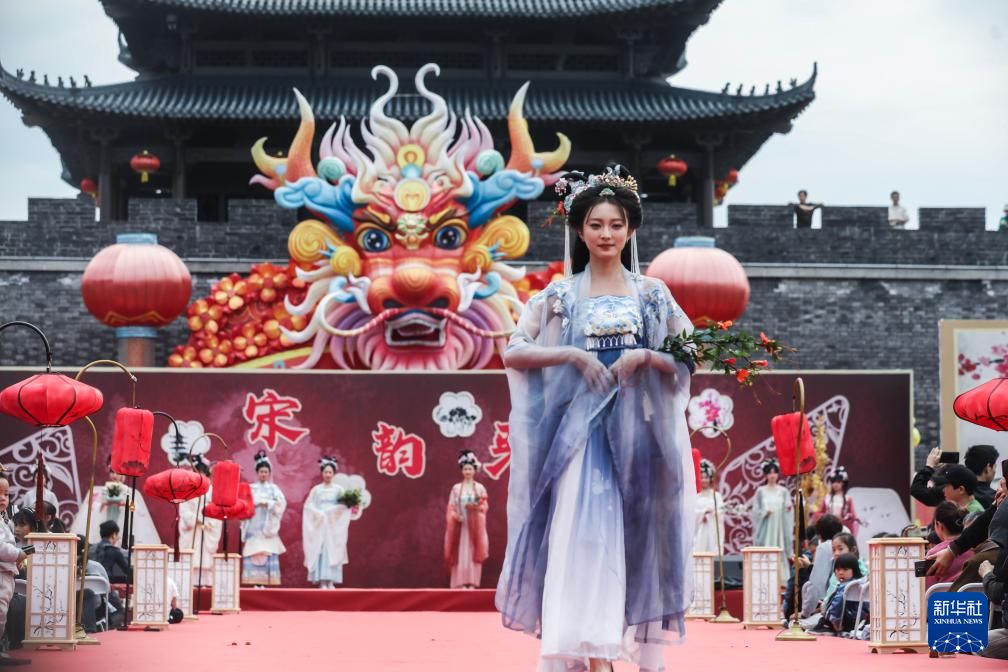 5月2日,在严州古城的城门前,演员身着传统服饰参加宋韵服饰展示活动。新华社