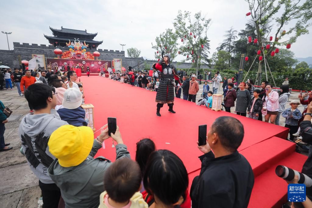 5月2日,在严州古城的城门前,演员身着传统甲胄参加宋韵服饰展示活动。新华社
