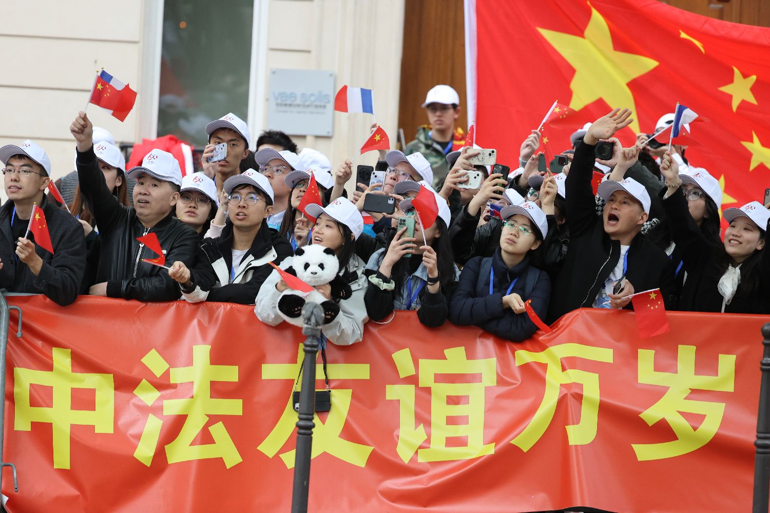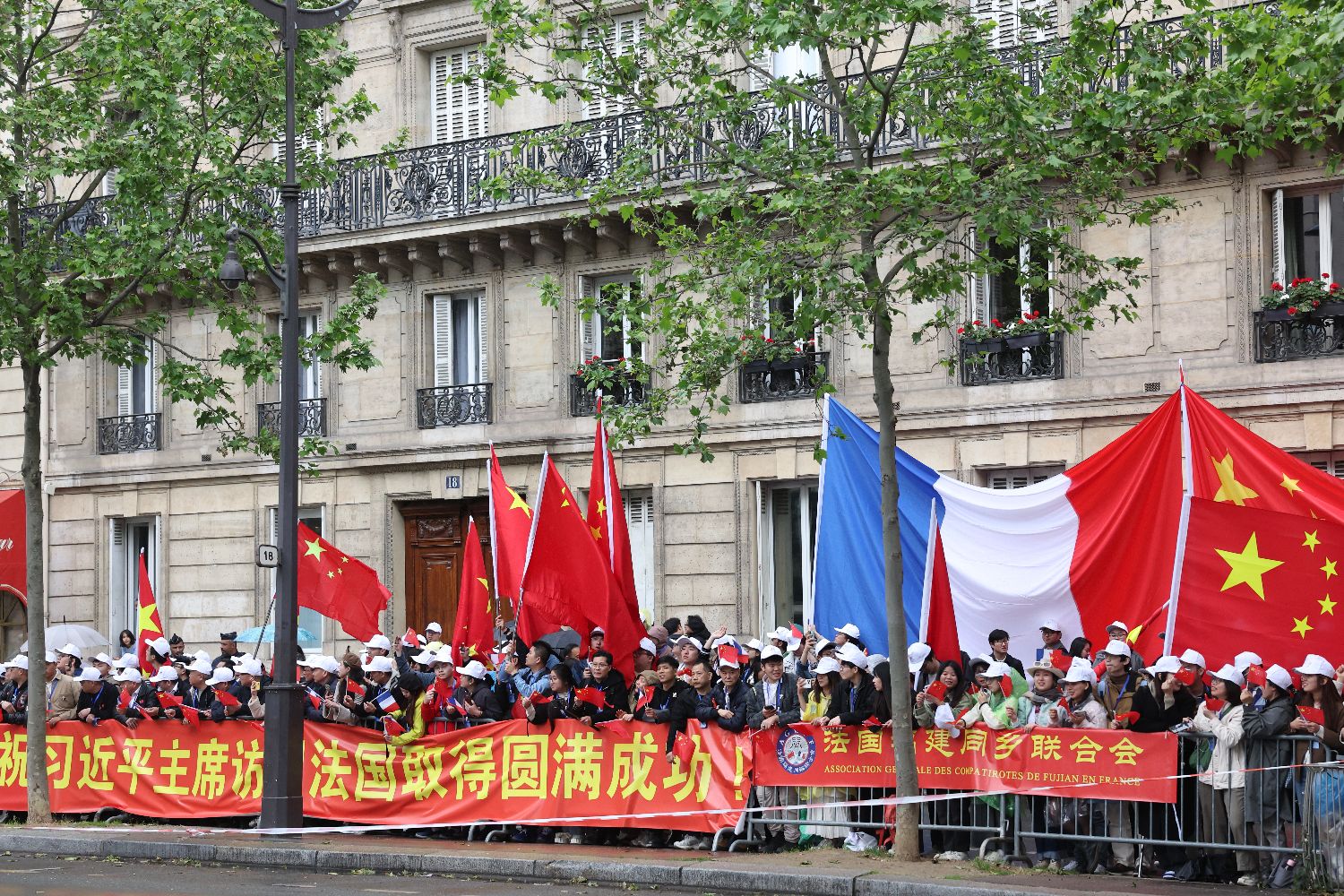当地时间5月5日,在巴黎街头,华侨华人和中国留学生高举“中法友谊万岁!”“祝习近平主席访问法国取得圆满成功!”等红色横幅,挥舞中法两国国旗,热烈欢迎习近平到访。中新社