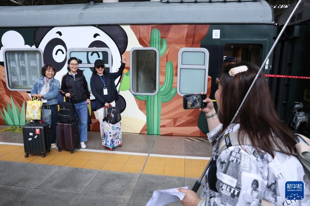 旅客在“熊猫专列”前拍照留念。新华社