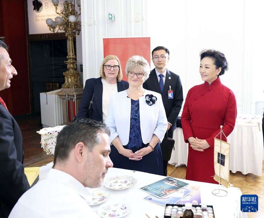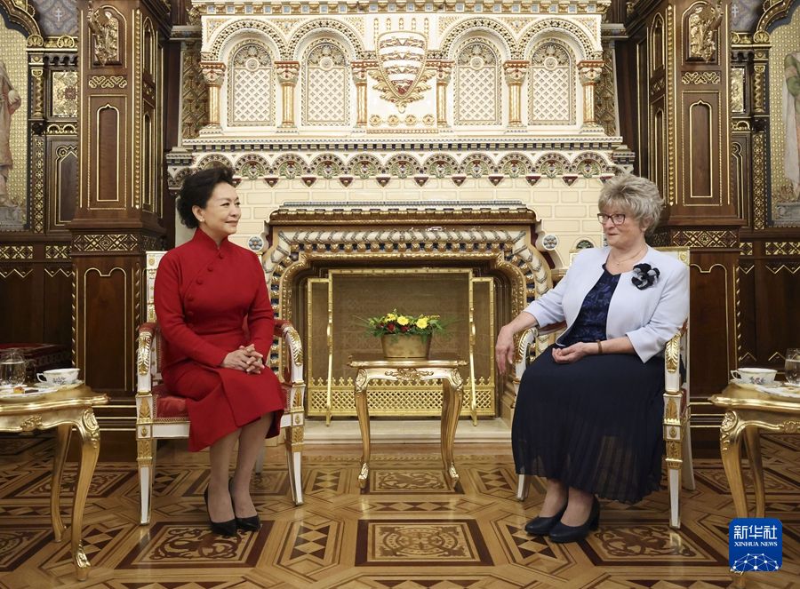 当地时间5月9日上午,彭丽媛同纳吉共同参观布达王宫并茶叙。