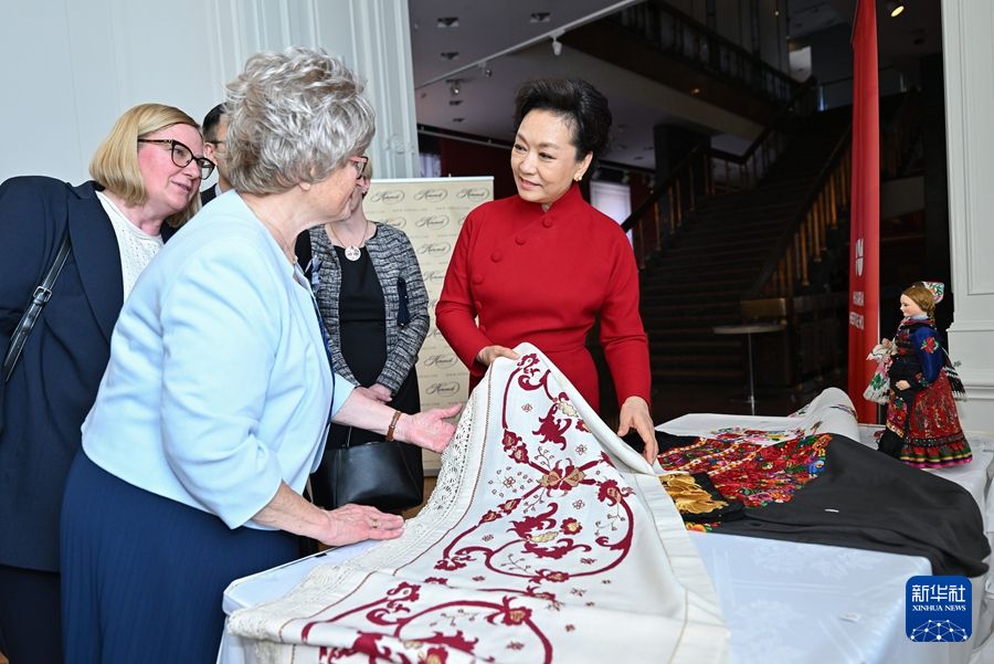 彭丽媛在纳吉陪同下欣赏匈牙利传统刺绣技艺展示。