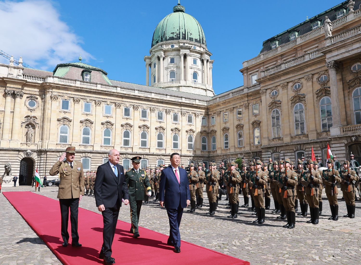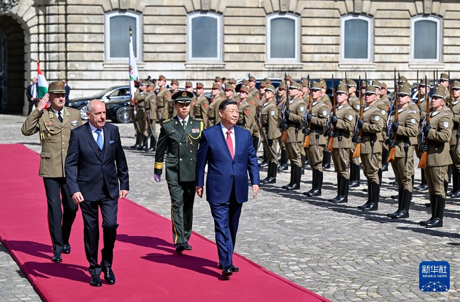 5月9日,习近平在布达佩斯出席舒尤克和欧尔班共同举行的欢迎仪式。新华社