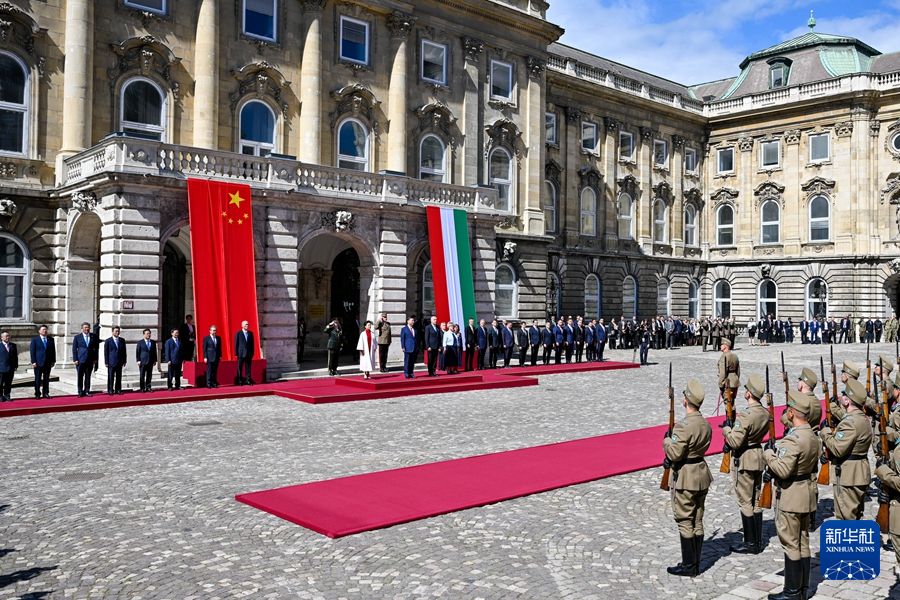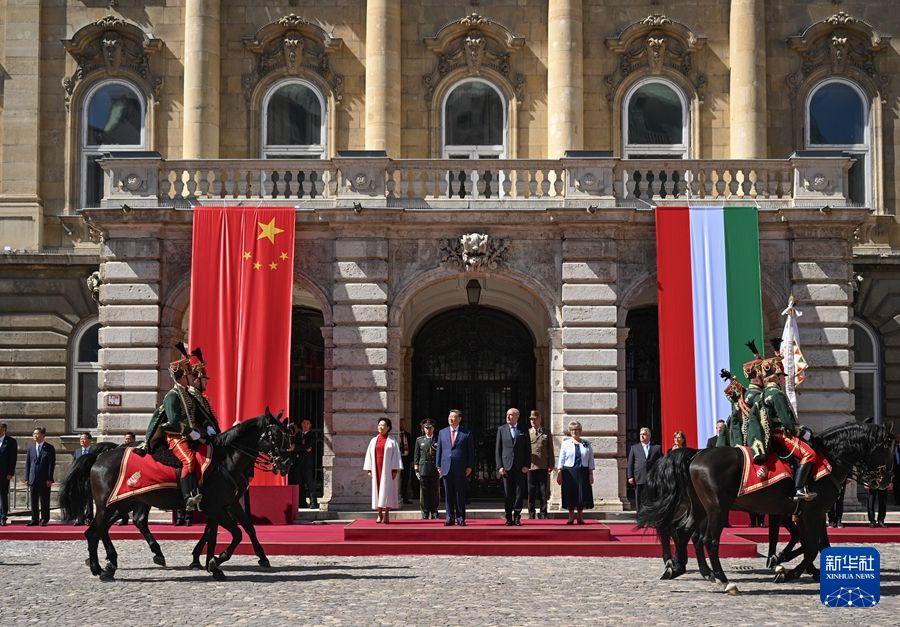 5月9日,习近平和夫人彭丽媛乘坐的国宾车队在匈牙利礼宾马队护卫下缓缓驶入布达王宫内庭。舒尤克总统夫妇和欧尔班总理夫妇热情迎接。两国元首共同登上检阅台,军乐团奏中匈两国国歌。习近平在舒尤克陪同下检阅国防军仪仗队和骑兵仪仗队。两国领导人夫妇分别同对方陪同人员握手,互致问候。新华社