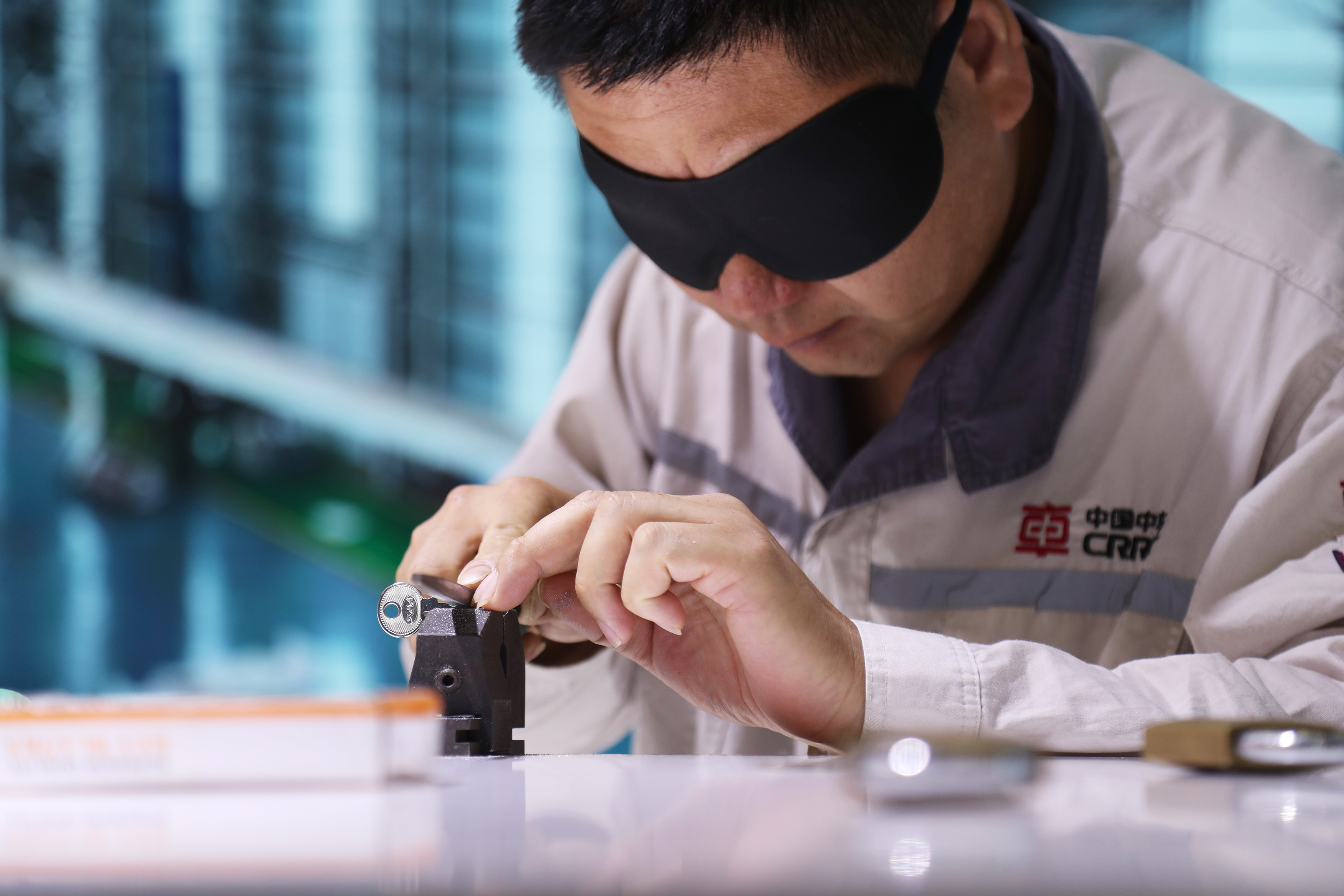 5月10日,中国工匠表演“盲配钥匙”绝活。中新社