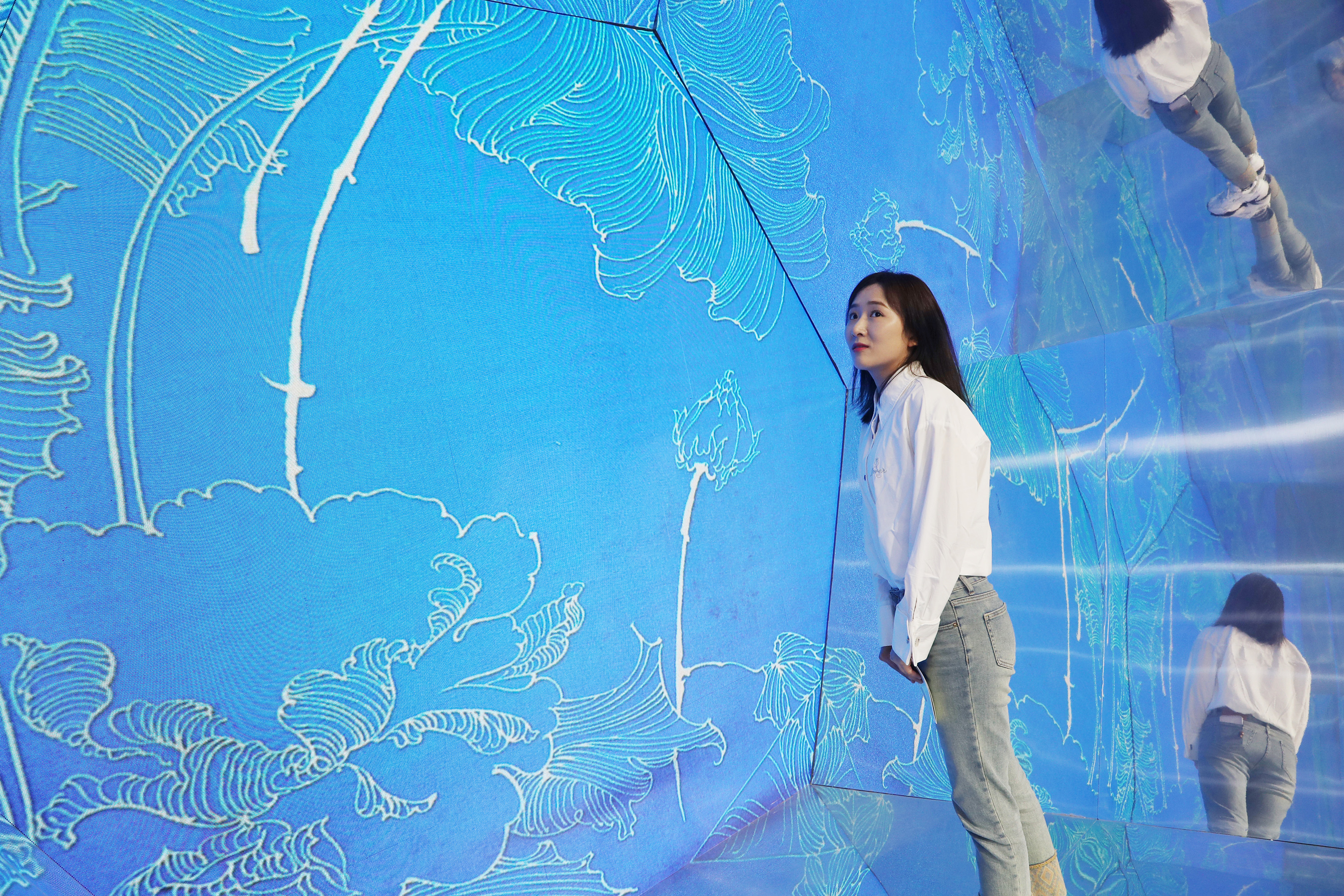 5月10日,观众体验3D刺绣景观作品。 中新社