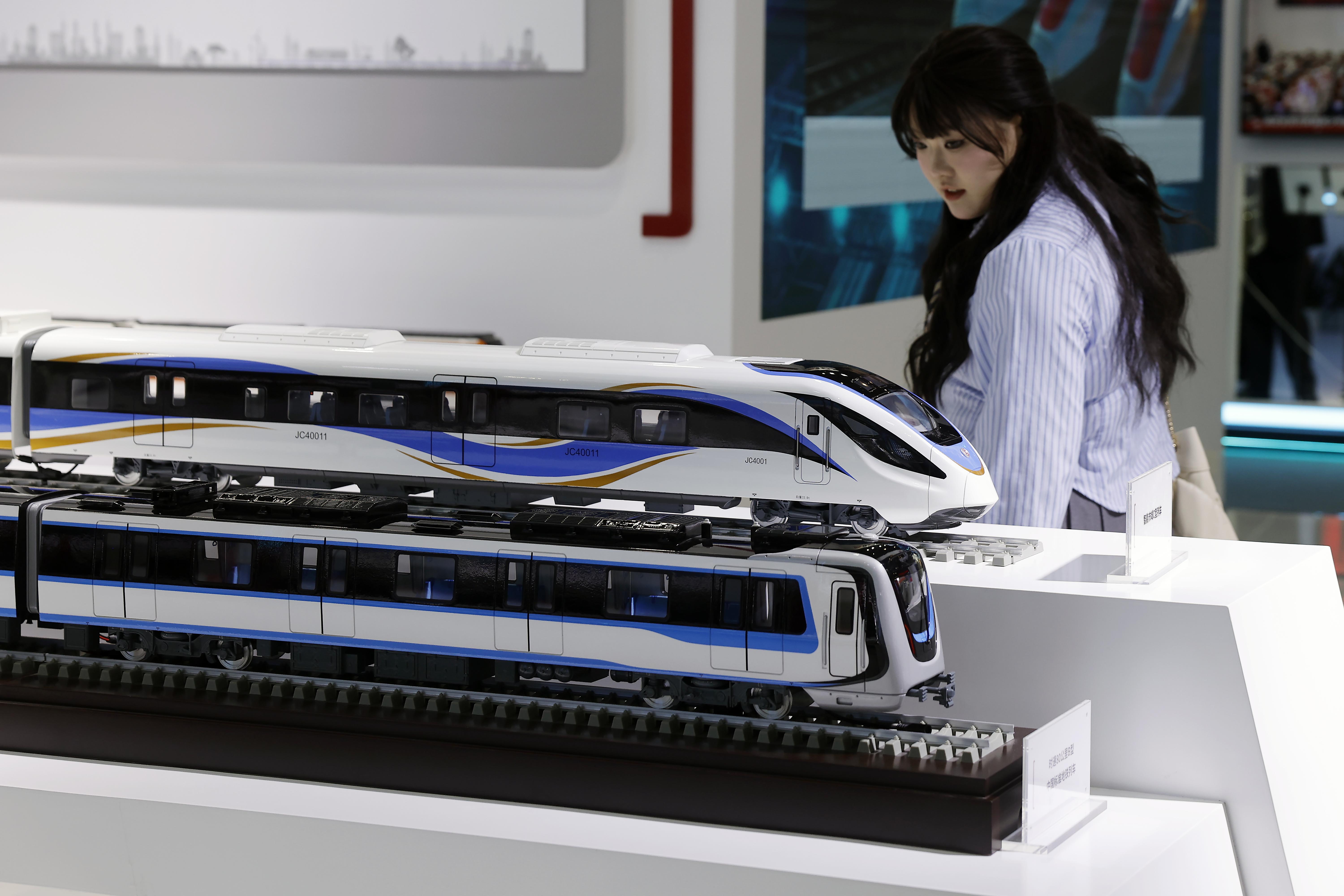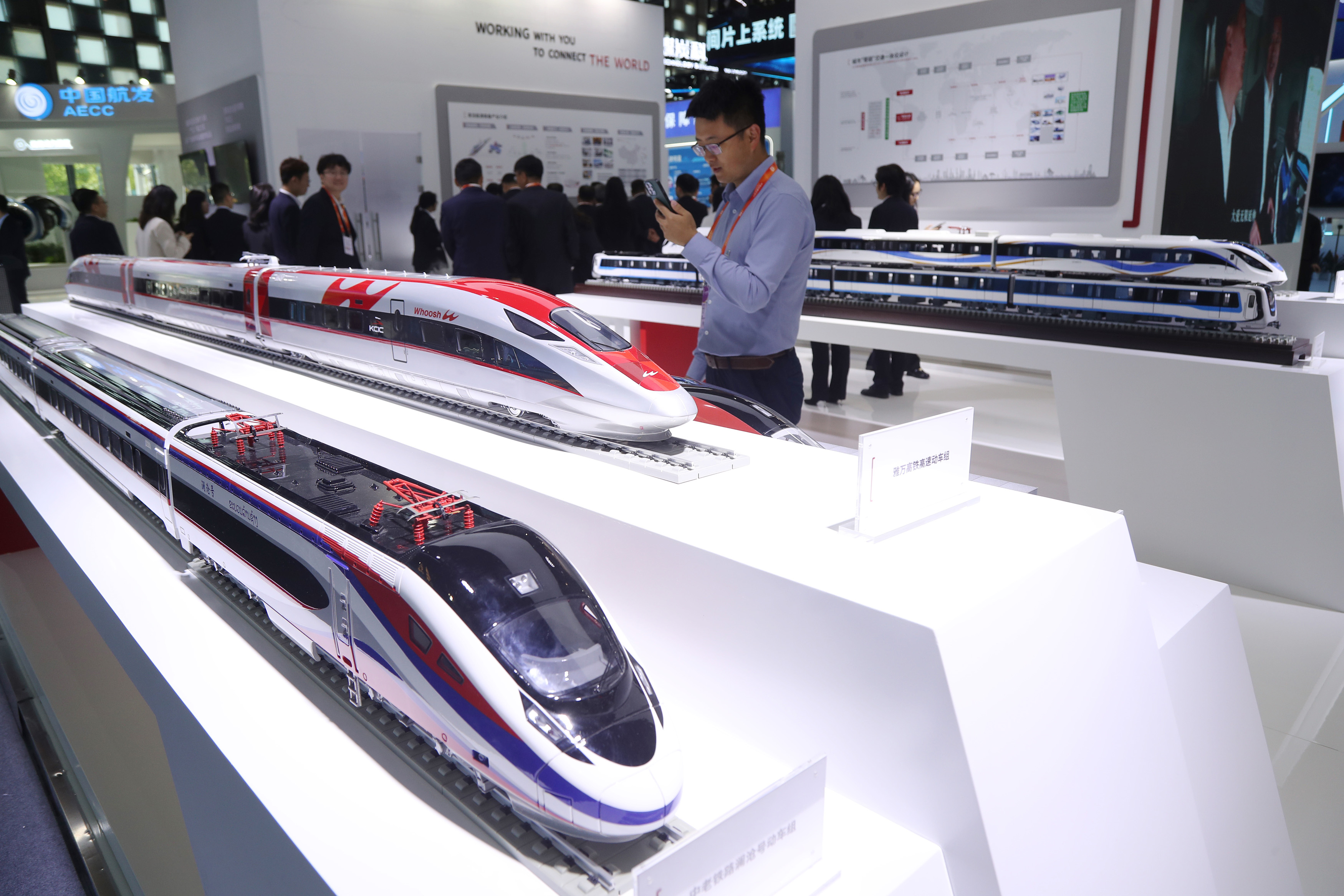 中国中车展示雅万高铁动车组(中)、中老铁路“澜沧号”动车组(下)模型。 中新社