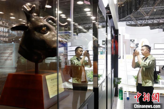 观众拍摄保利艺术博物馆收藏的圆明园十二兽首之牛首、虎首、猴首、猪首(仿制品)。中新网