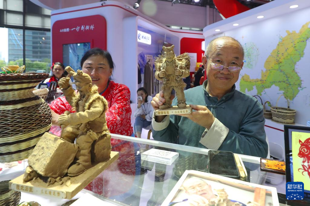 5月12日,来自陕西榆林的农民艺术家王文瑜(右)展示他的泥塑艺术作品《财源滚滚》。新华社