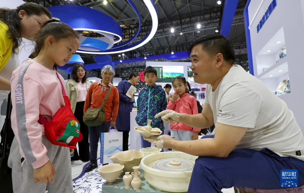 5月12日,江西景德镇展台的工作人员(右)向参观者介绍瓷器制作的步骤。新华社