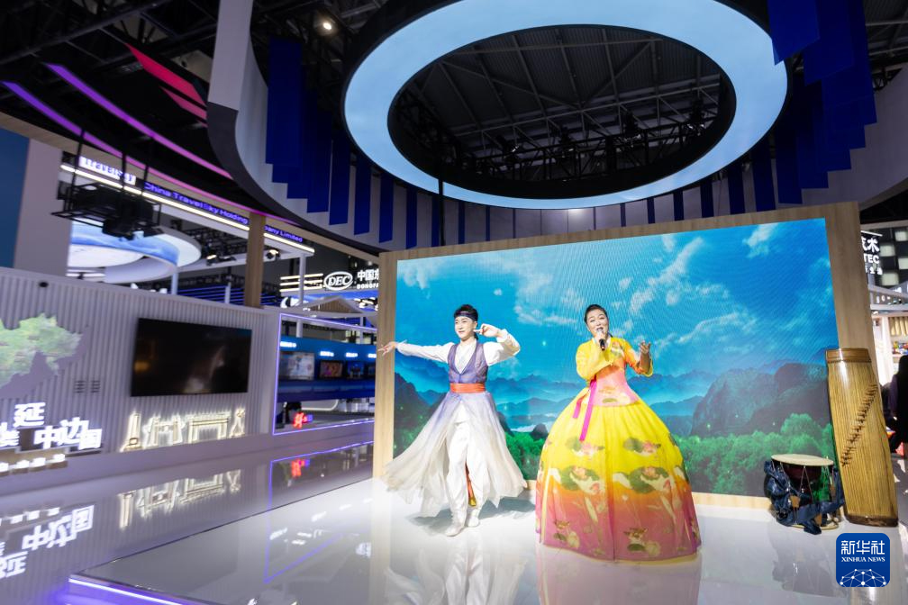 5月12日,演员在延边展台表演歌舞。新华社