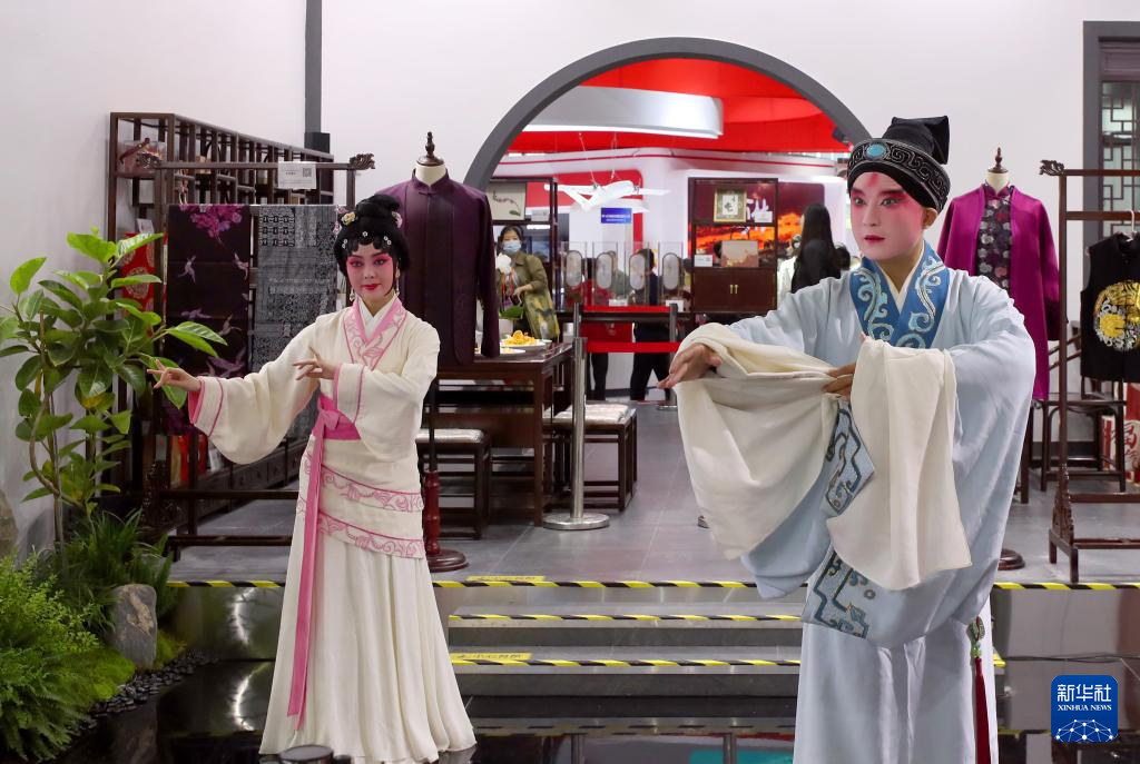 5月11日,演员在江苏苏州展台上表演昆剧《浣纱记》。新华社