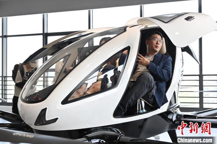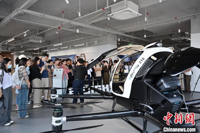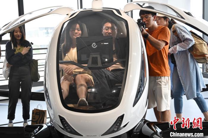 5月14日,广州市黄埔区,媒体记者在广州亿航智能技术有限公司展厅参观体验亿航EH216-S无人驾驶载人航空器。