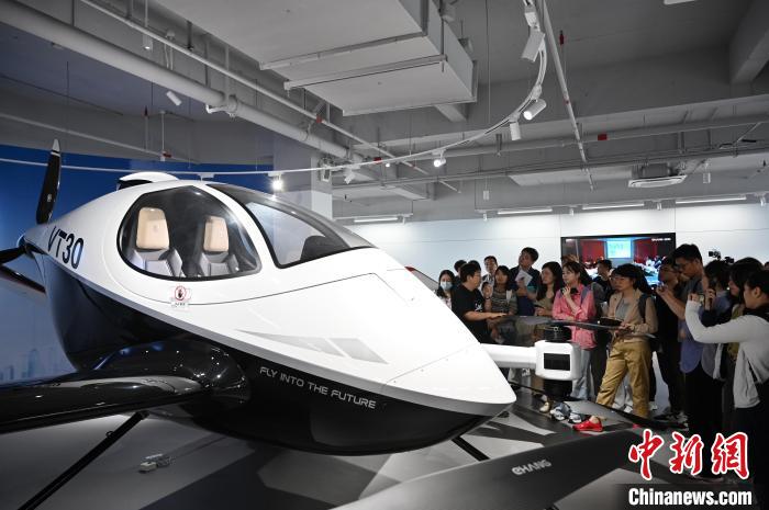 媒体记者在广州亿航智能技术有限公司展厅参观拍摄亿航VT30长航程载人级自动驾驶飞行器。