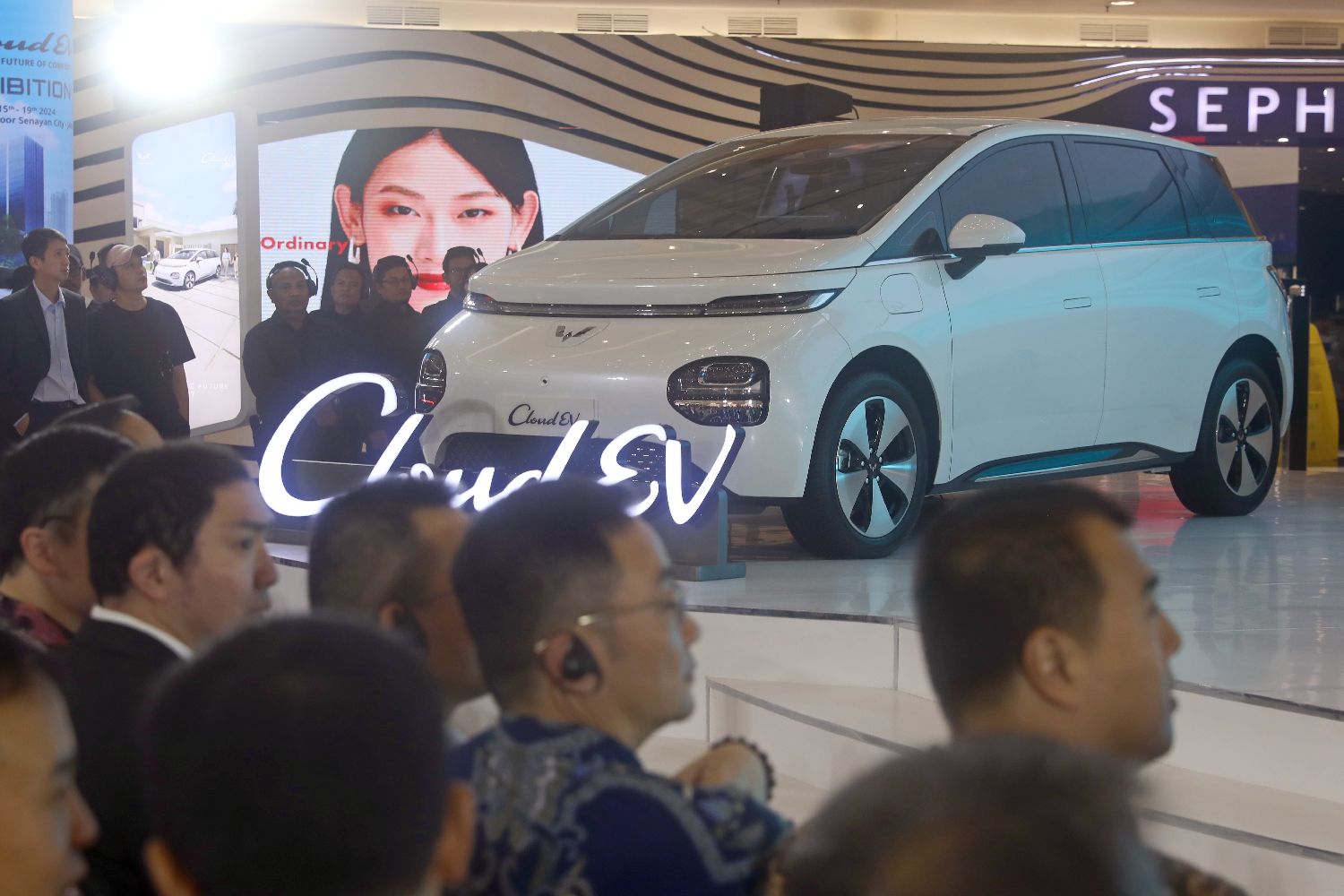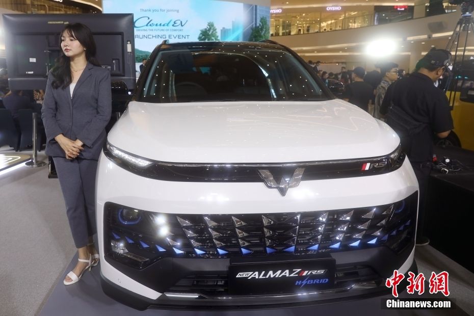 当地时间5月15日,中国车企五菱在印尼雅加达发布新款电动车——CloudEV(宝骏云朵)。经过三年的布局,五菱印尼三款新能源产品(Air Ev,BinguoEV,CloudEV)已进入印尼乘用车市场。图为发布会现场。中新社