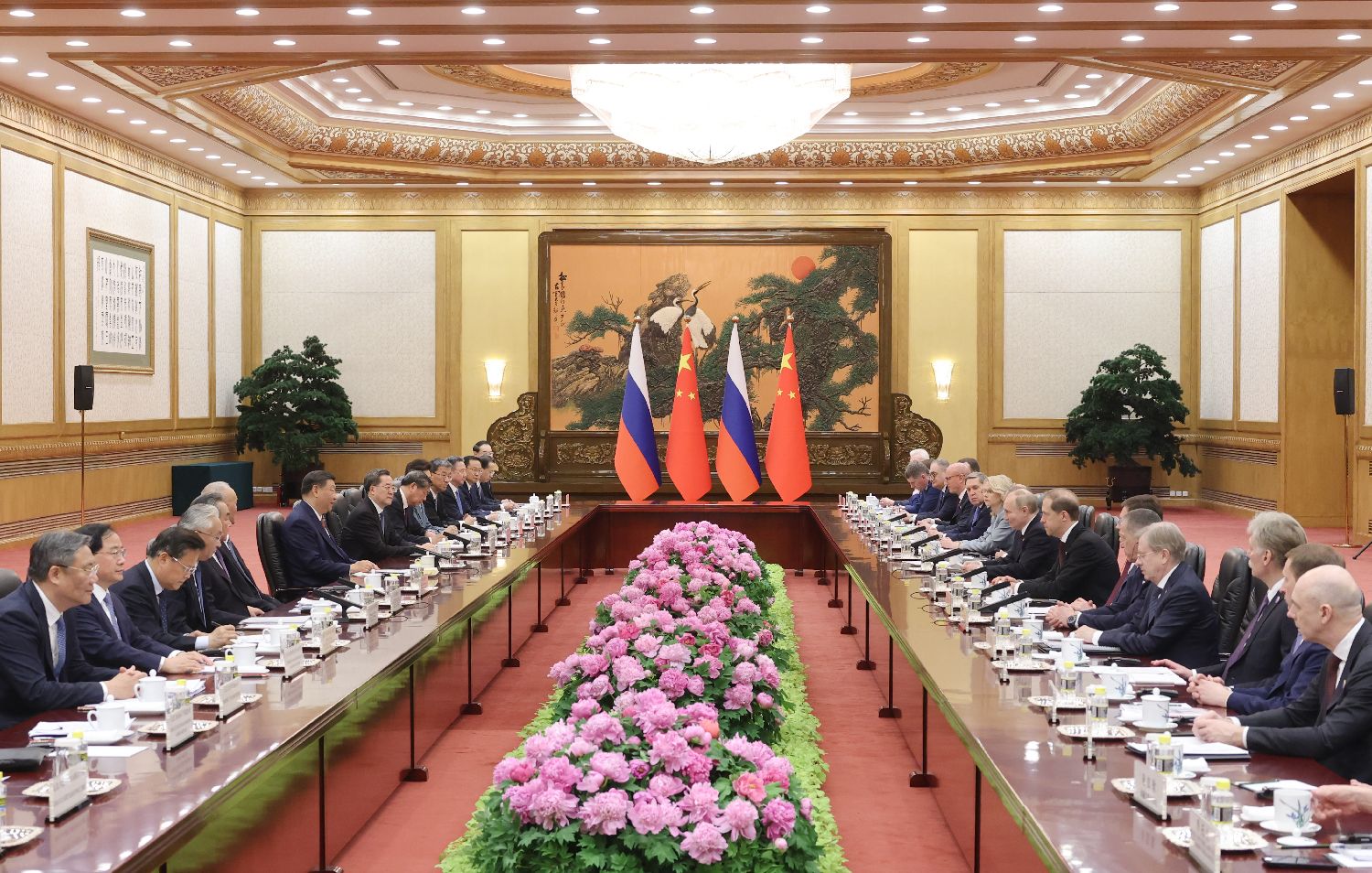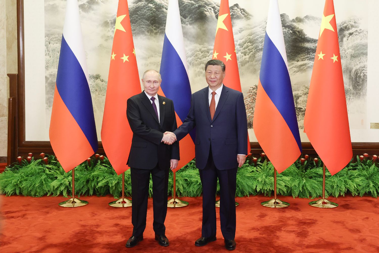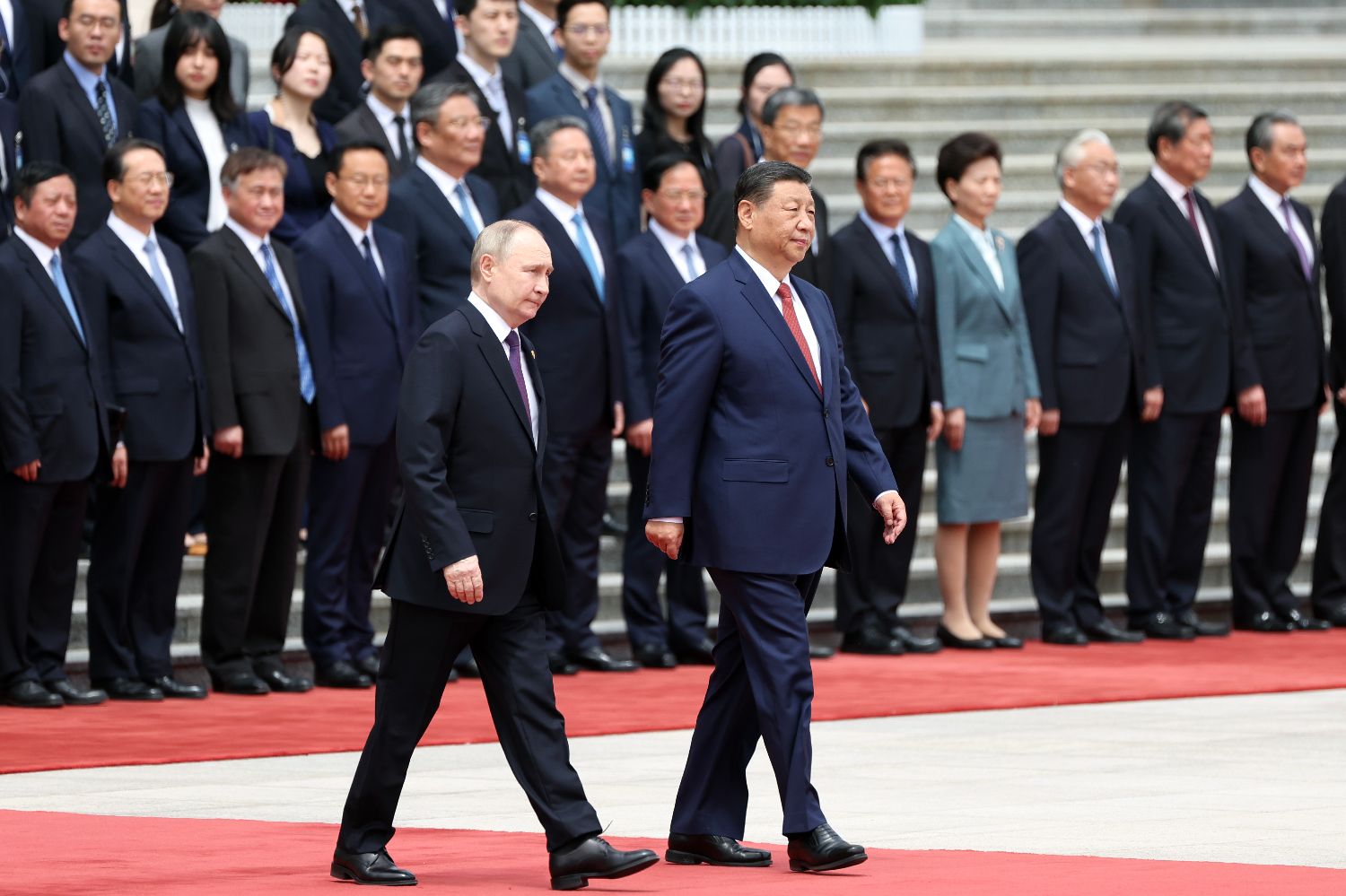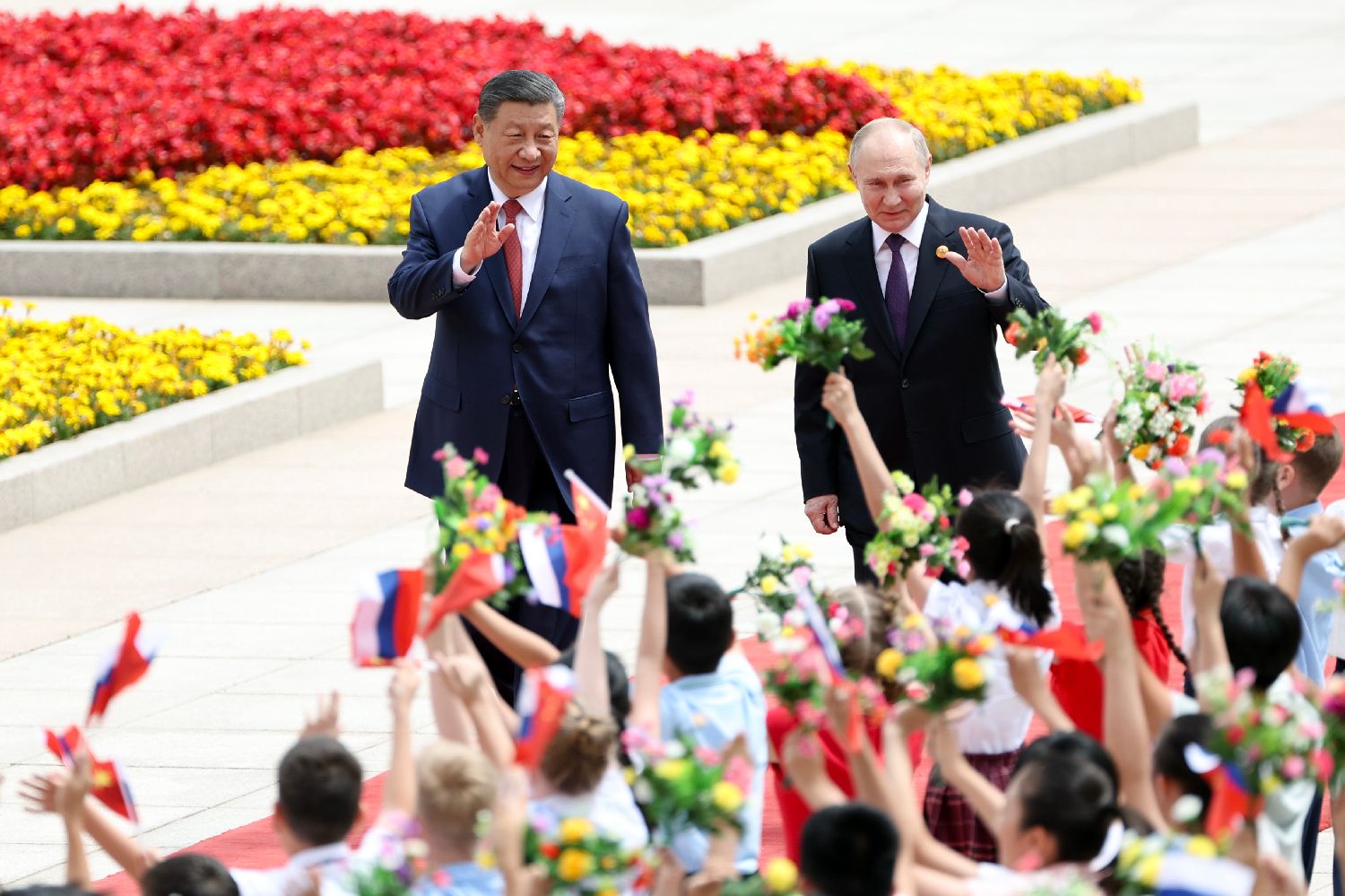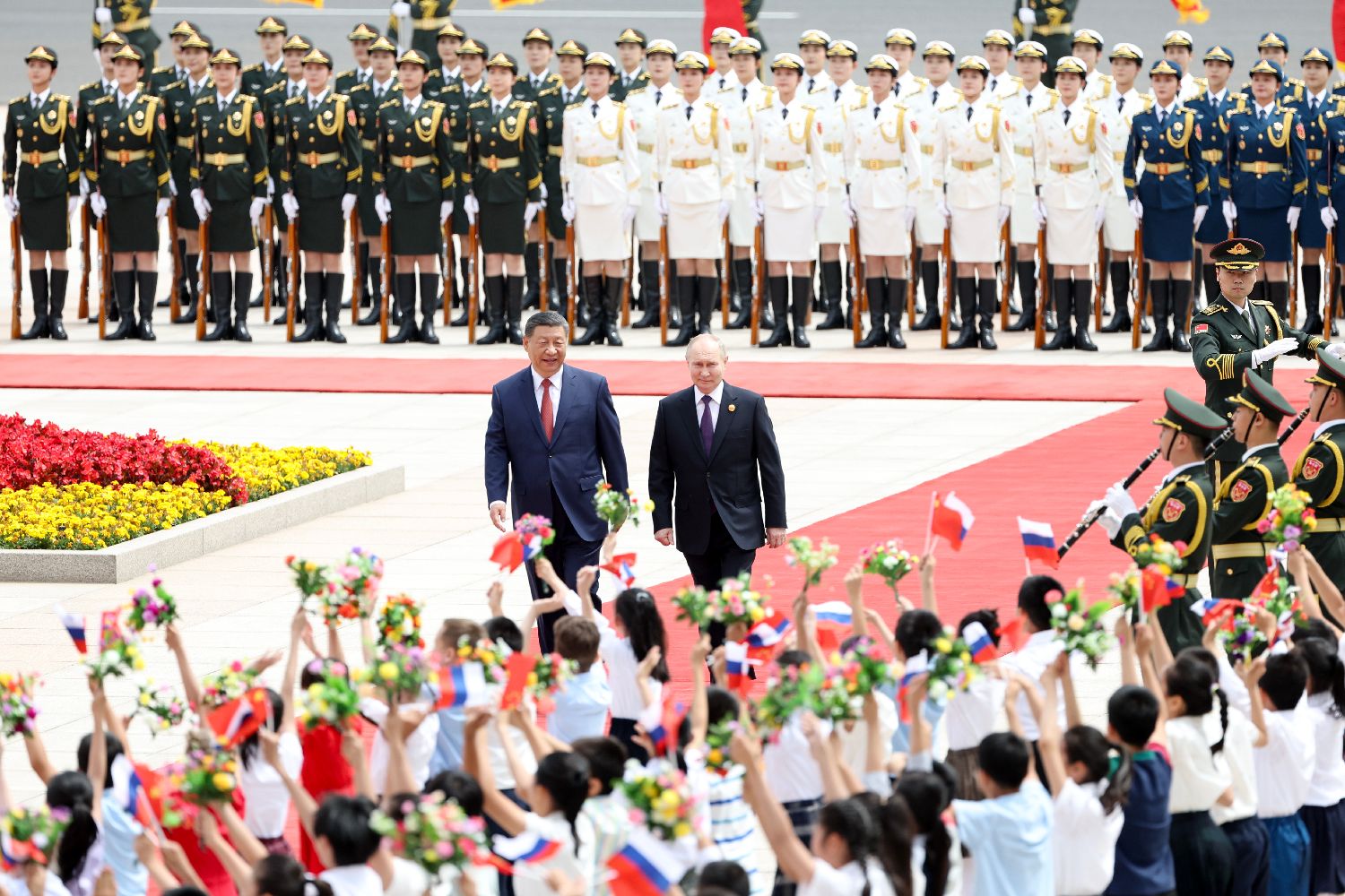 当地时间5月16日上午,中国国家主席习近平在北京人民大会堂同赴华进行国事访问的俄罗斯总统普京举行会谈。下午,习近平和普京在北京国家大剧院共同出席“中俄文化年”开幕式暨庆祝中俄建交75周年专场音乐会并致辞。当日晚,习近平在北京中南海同普京举行小范围会晤。图为5月16日上午,会谈前,习近平在人民大会堂东门外广场为普京举行隆重欢迎仪式。中新社