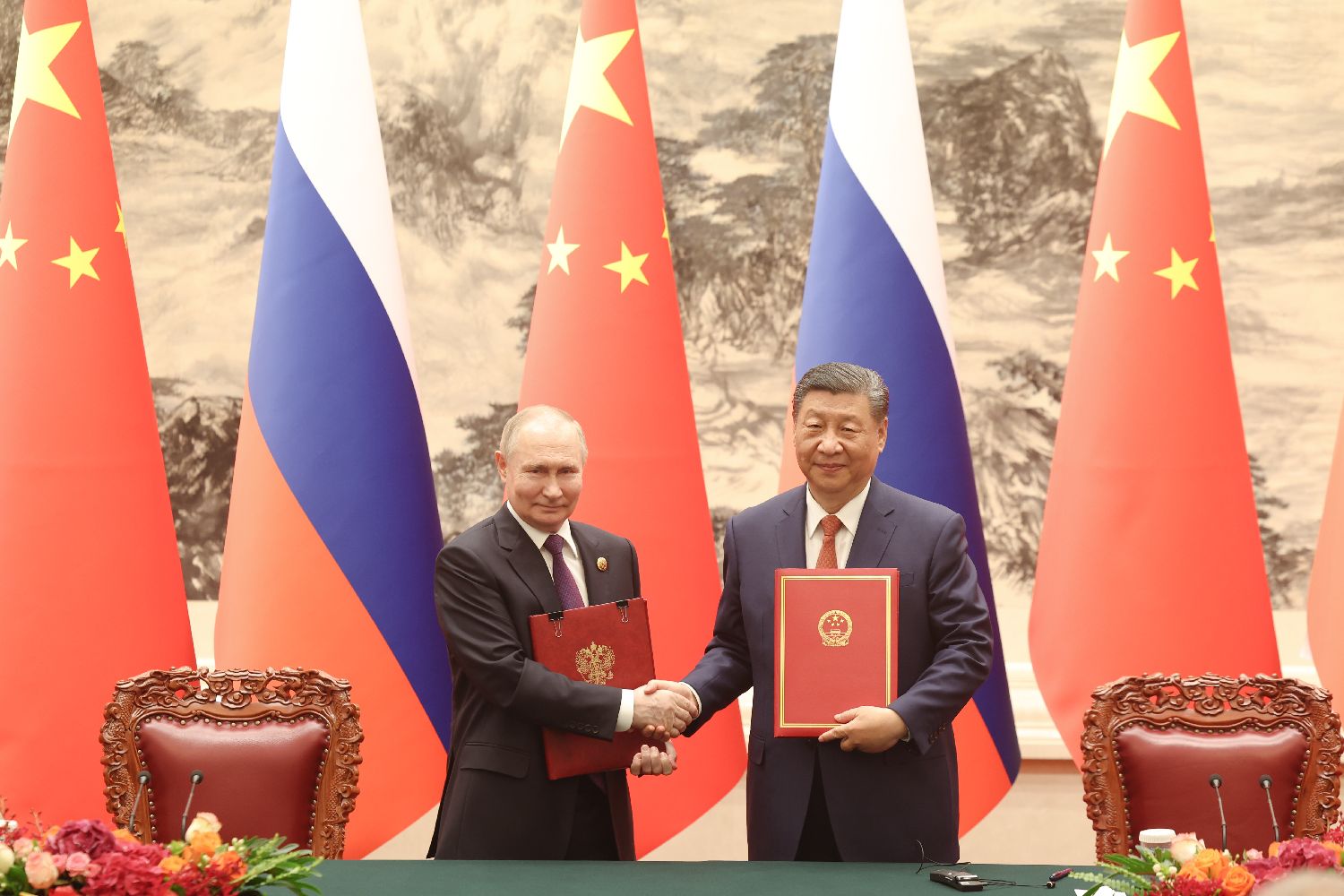 会谈后,两国元首共同签署并发表《中华人民共和国和俄罗斯联邦在两国建交75周年之际关于深化新时代全面战略协作伙伴关系的联合声明》。中新社
