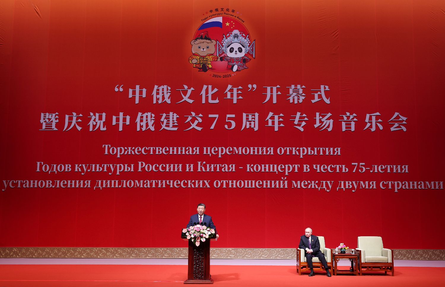 习近平在“中俄文化年”开幕式暨庆祝中俄建交75周年专场音乐会致辞。中新社