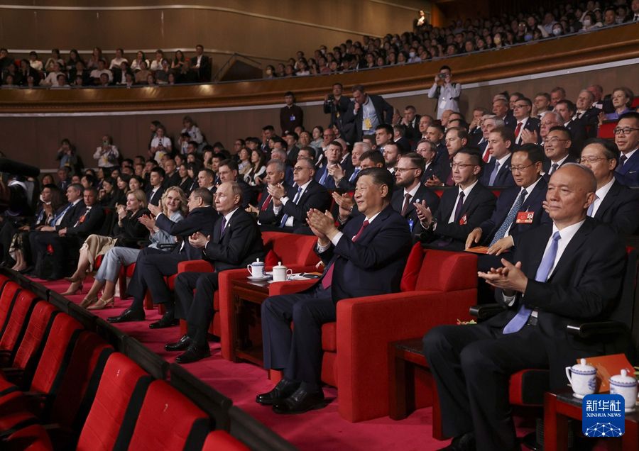 两国元首共同欣赏由中俄两国艺术家联袂呈现的精彩文艺演出。新华社