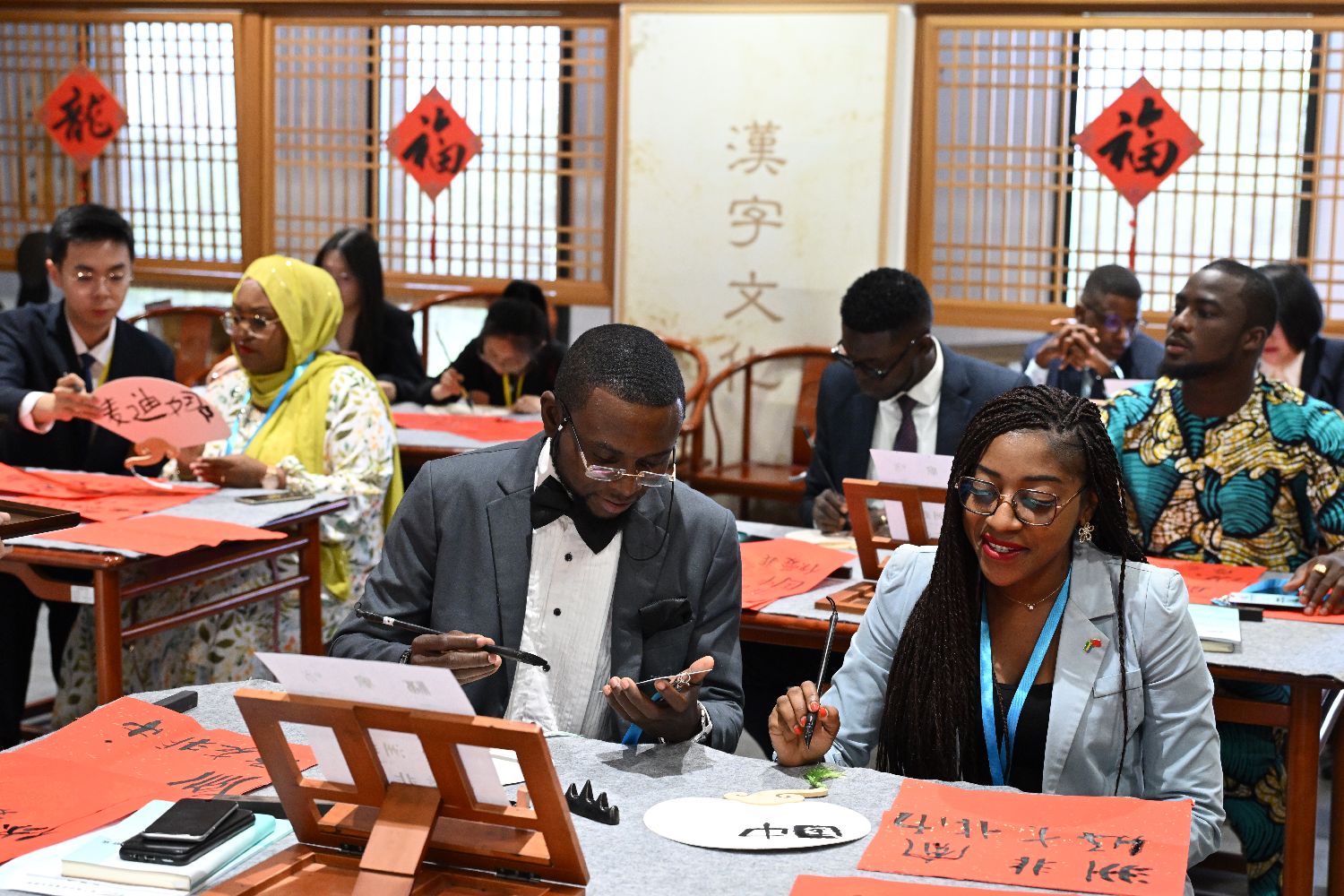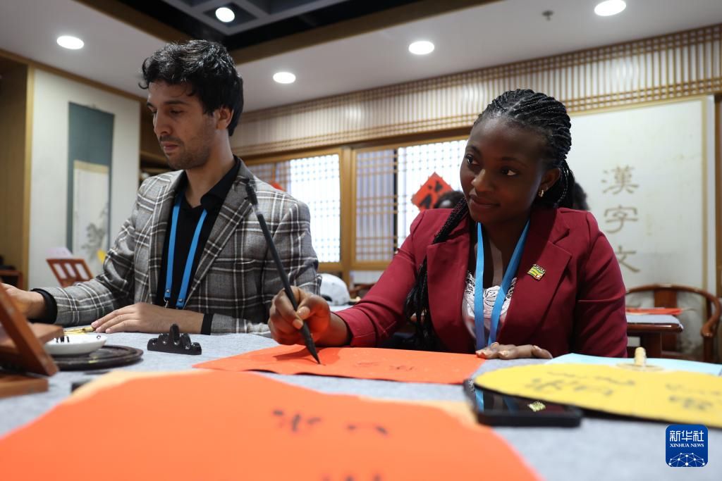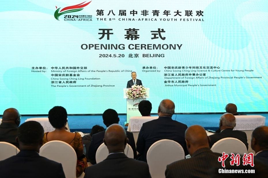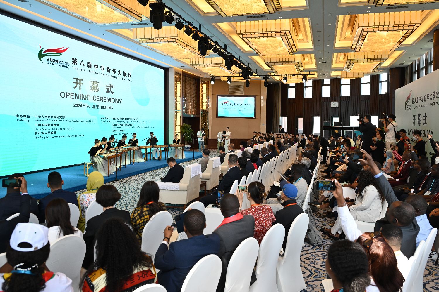 5月20日,第八届中非青年大联欢在位于北京的中国宋庆龄青少年科技文化交流中心开幕。本次中非青年大联欢以“汇聚青春力量 共建中非现代化”为主题,由外交部、中国宋庆龄基金会、浙江省人民政府主办,来自中非合作论坛成员中的52个非方成员的共64名非方青年代表参加。当日,参加大联欢活动的中非青年代表走进位于北京的中国宋庆龄青少年科技文化交流中心,体验印染、刺绣、书法等多种民俗,感受中国传统文化的魅力,在交流互动中增进友谊。今年大联欢活动于5月19日至26日在北京和浙江金华举办。图为开幕式现场。中新社