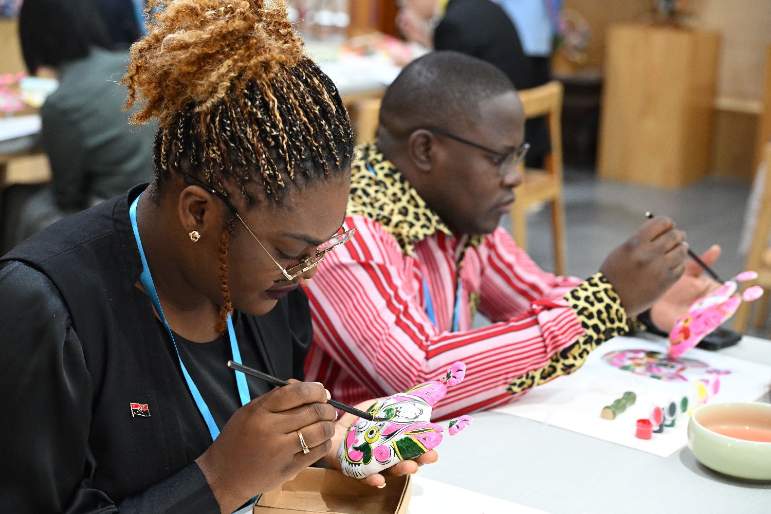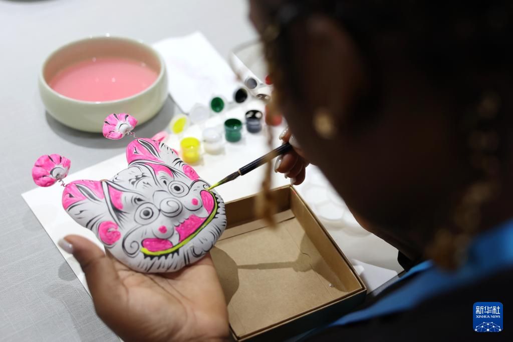非方青年代表体验凤翔泥塑的彩绘过程。中新社