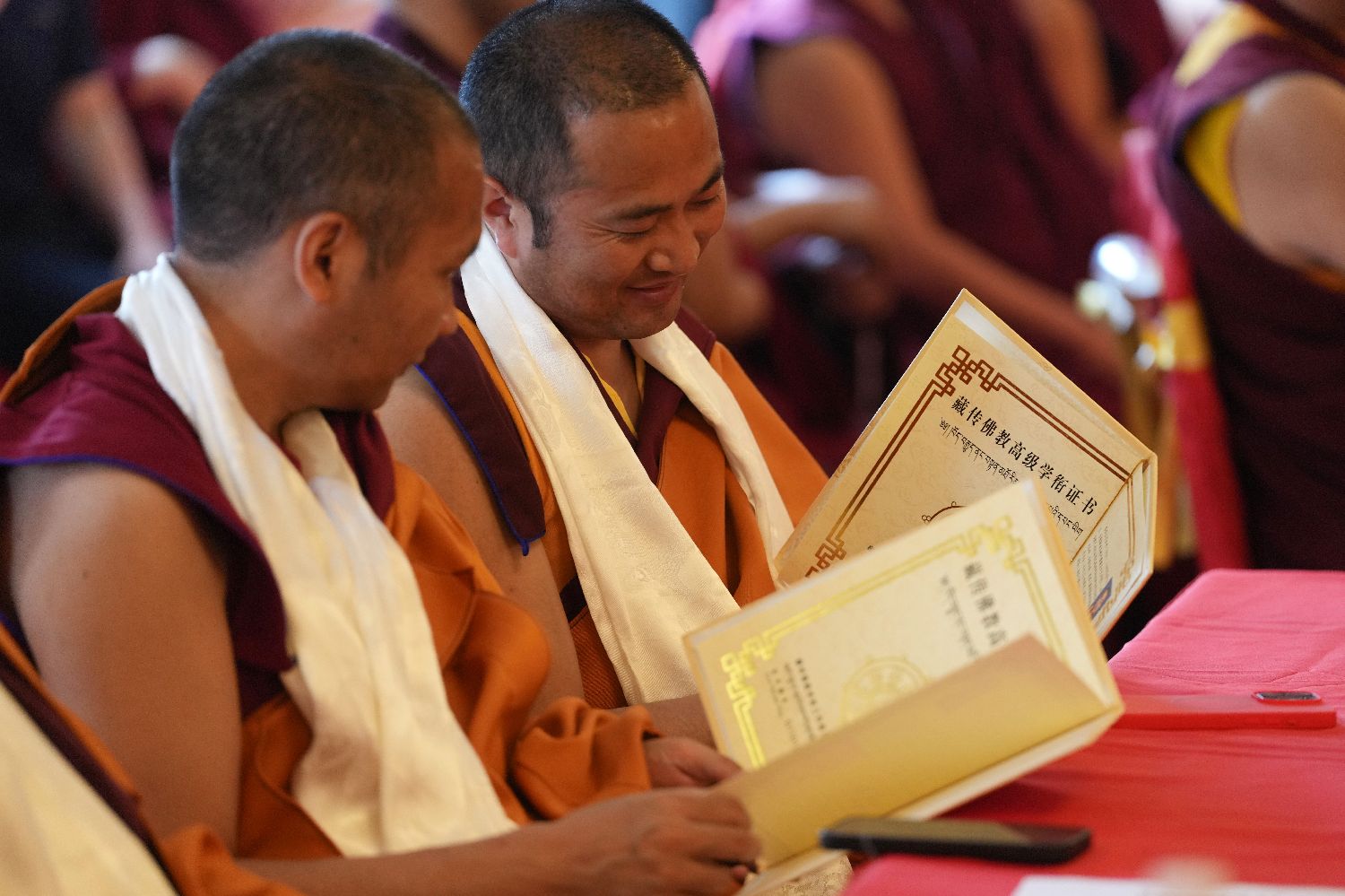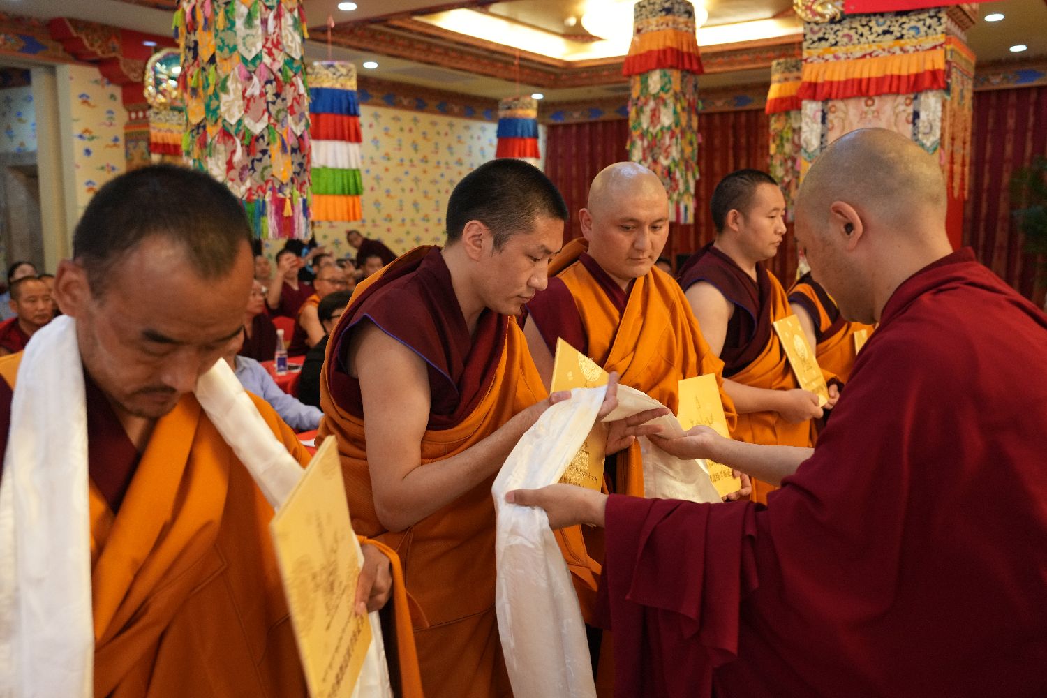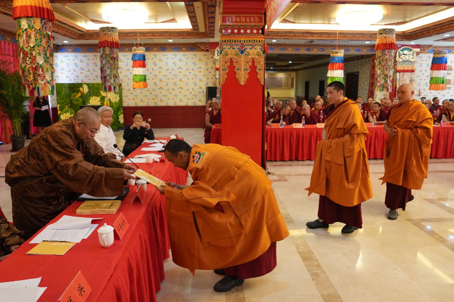 5月23日,中国佛教协会副会长、藏传佛教学衔工作指导委员会主任、中国藏语系高级佛学院院长嘉木样活佛向觉囊派“拓然巴”高级学衔获得者颁发学衔证书。
