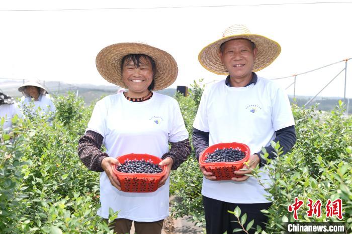 5月22日,在山东省日照市东港区陈疃镇现代农业(蓝莓)产业园,村民展示采摘的蓝莓。新华社