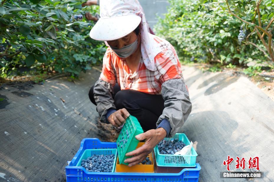 山东省日照市东港区陈疃镇自2005年发展蓝莓种植以来,种植面积已达到2.5万亩,有珠宝、天后、蓝宝石等30多个品种,年产值近4亿元。图为5月22日,农户在采摘蓝莓。中新社