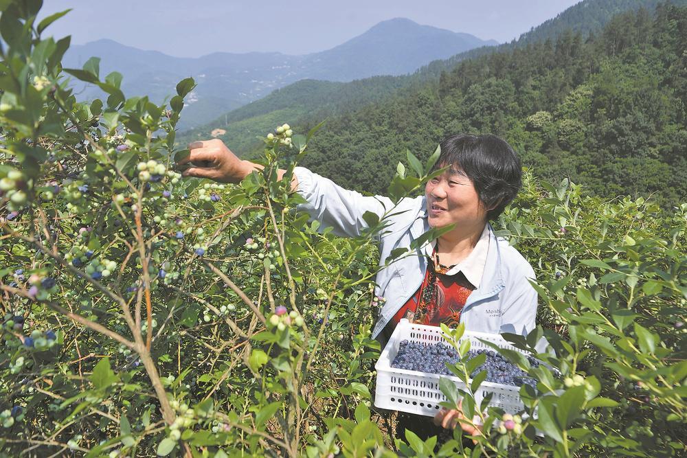 近日,湖北保康高山蓝莓进入成熟期,当地农民加紧采摘,供应市场。目前,保康已建成蓝莓标准化示范基地8000多亩,形成了集种植、加工、采摘、乡村旅游为一体的全产业链。图为5月22日,村民在保康县官山蓝莓种植基地采摘蓝莓。《襄阳晚报》