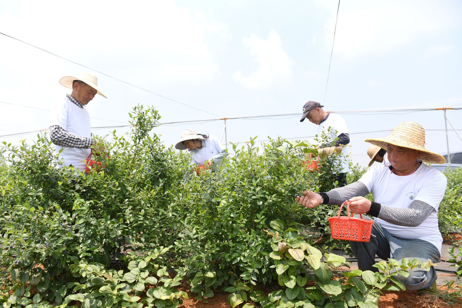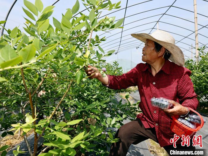 5月23日,长沙智博蓝莓产业园的果农采摘蓝莓。中新社