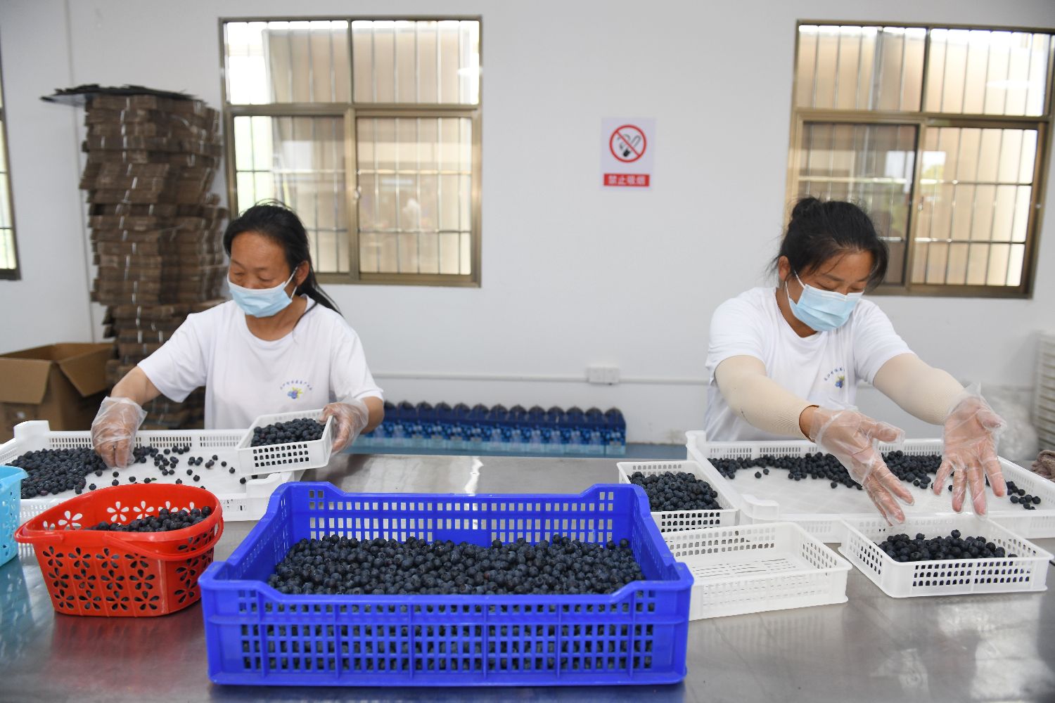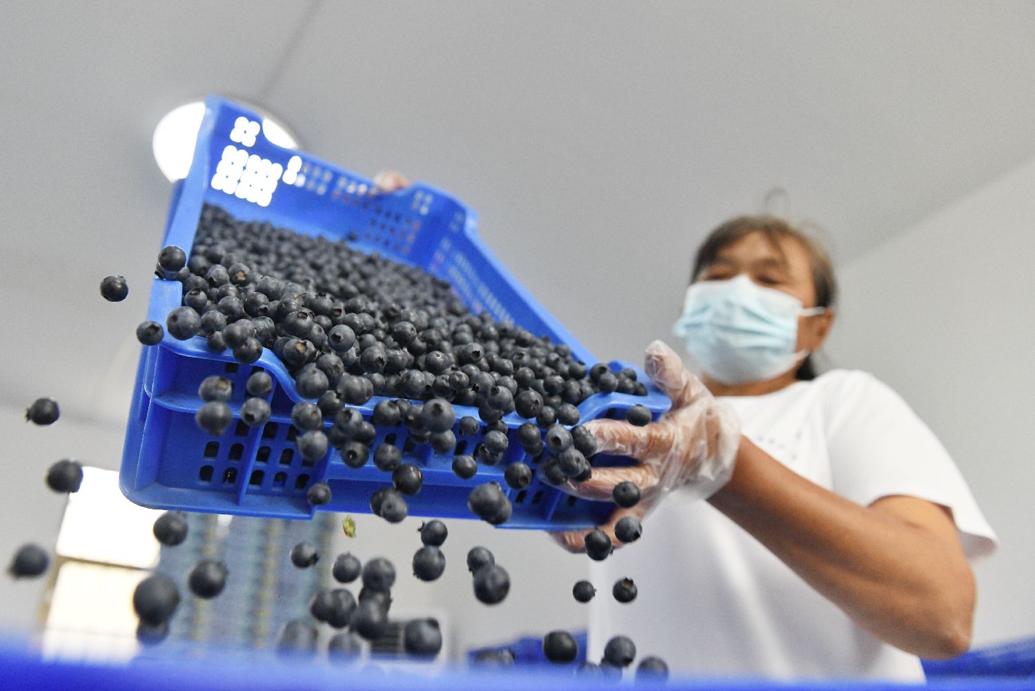 5月22日,在山东省日照市东港区陈疃镇蓝莓产学研基地,农户在给蓝莓分级。中新网