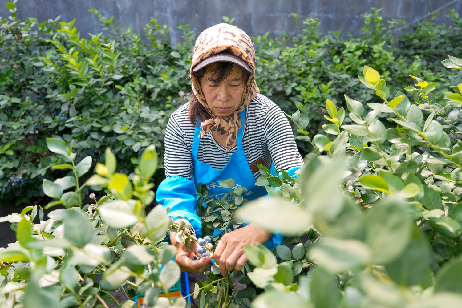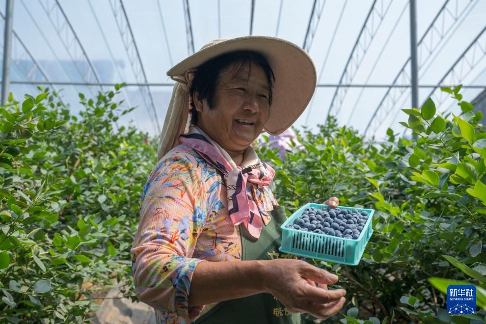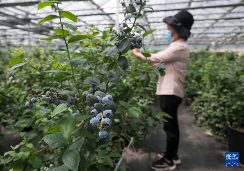 5月22日,在山东省日照市东港区陈疃镇现代农业(蓝莓)产业园,村民采摘蓝莓。新华社