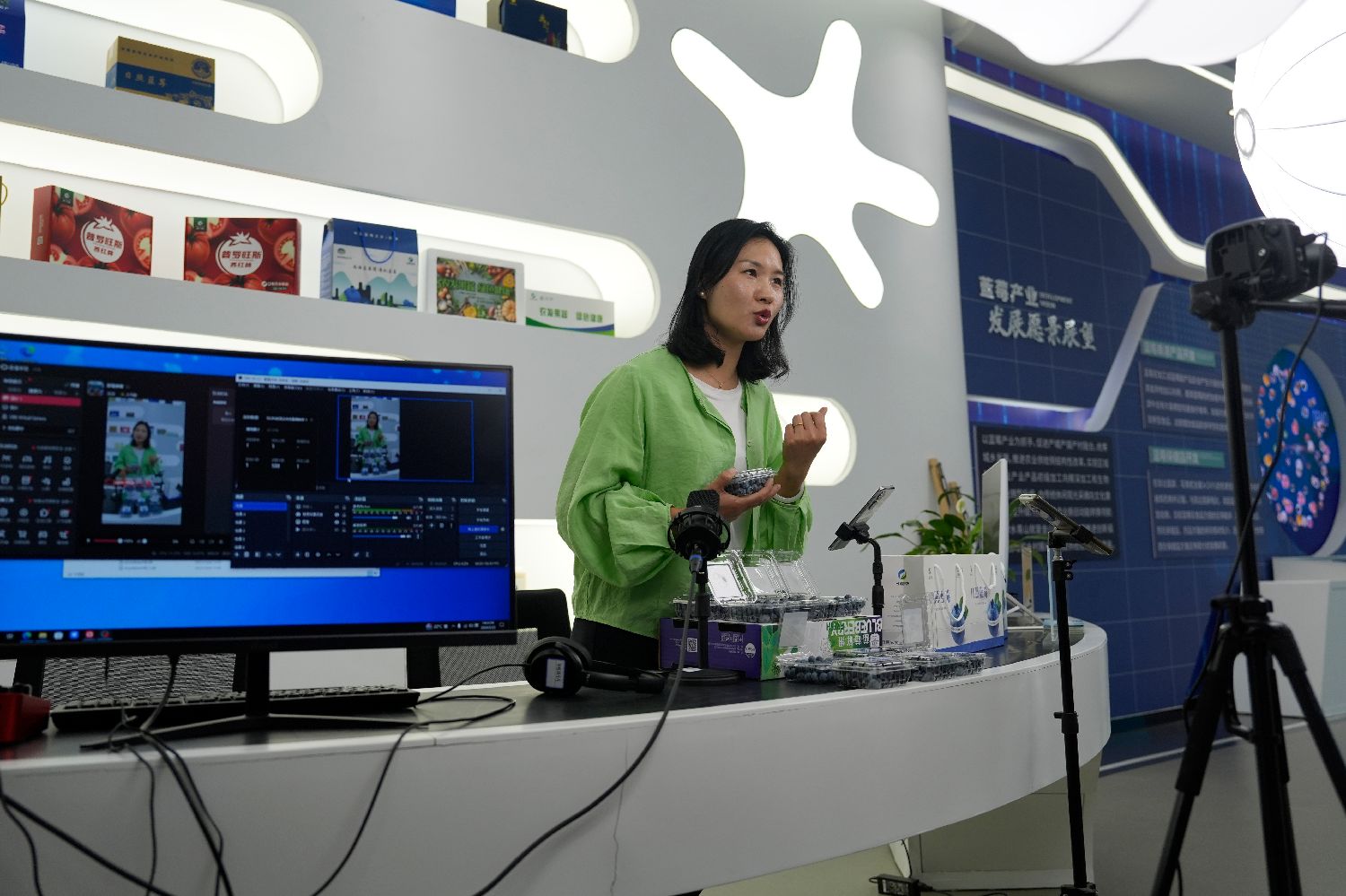 5月22日,在山东省日照市东港区陈疃镇蓝莓产学研基地,工作人员在直播销售蓝莓。中新社