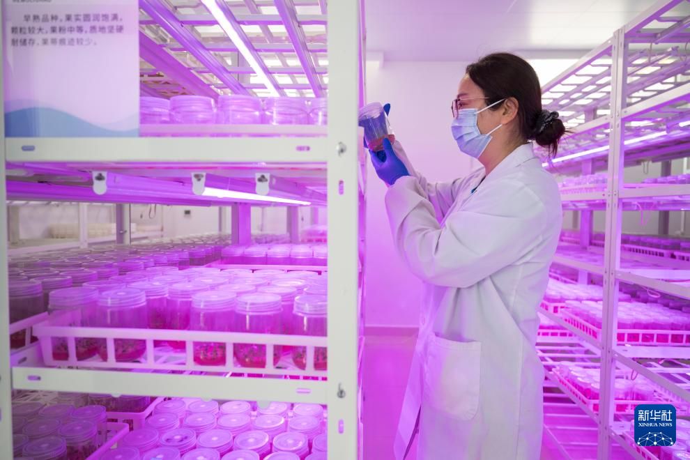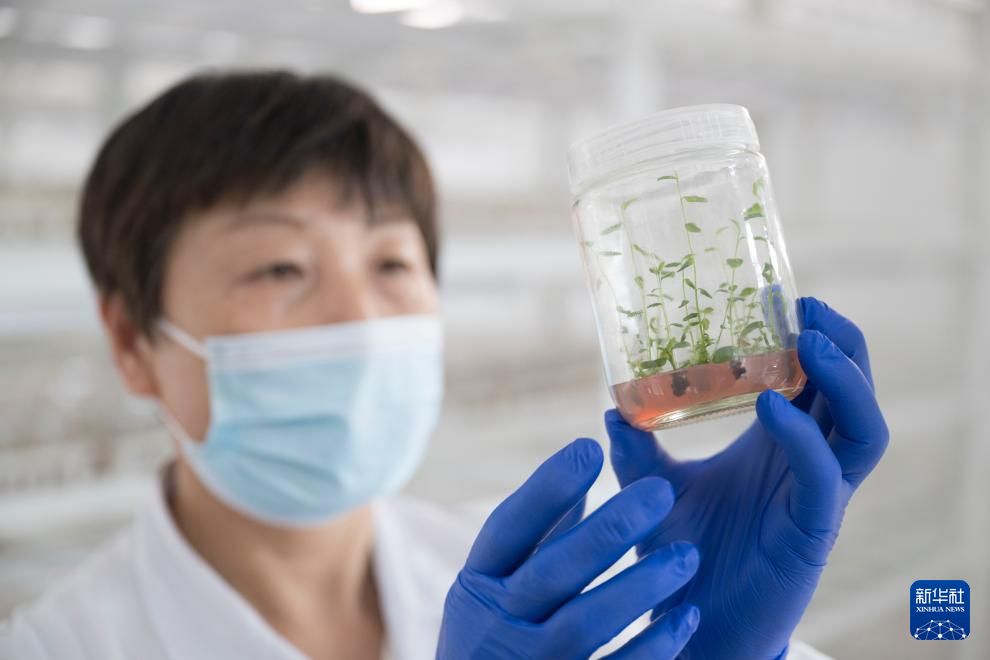 5月22日,在山东省日照市东港区陈疃镇现代农业(蓝莓)产业园,工作人员查看培养基质中的蓝莓组培幼苗。新华社