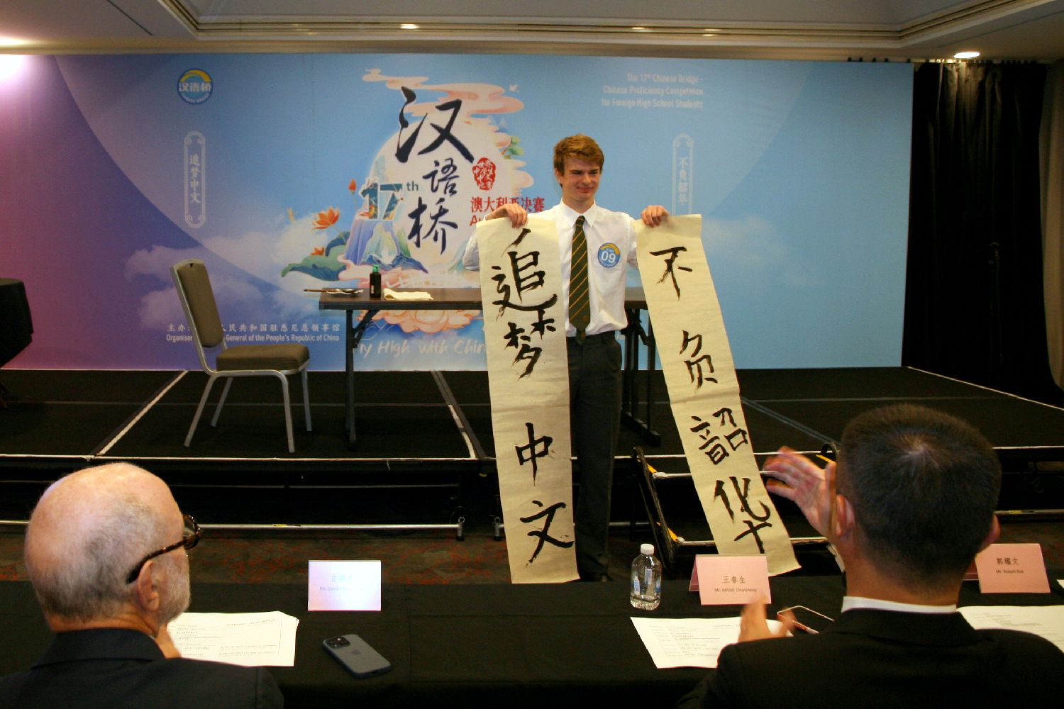 “汉语桥”中文比赛近日分别在委内瑞拉、古巴、越南、马达加斯加、葡萄牙、意大利、多哥、匈牙利、马耳他、坦桑尼亚等国举行。 当地时间5月26日,主题为“追梦中文,不负韶华”的第17届“汉语桥”世界中学生中文比赛澳大利亚赛区总决赛在悉尼举行。图为参赛选手在展示中国书法才艺。中新社