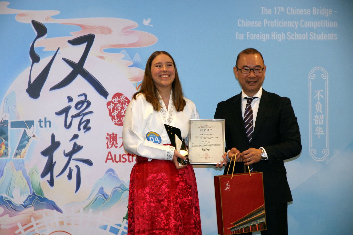 当地时间5月26日,悉尼市副市长郭耀文(右)给获得“汉语桥”世界中学生中文比赛澳大利亚赛区总决赛一等奖的来自珀斯的哈莉·理查兹(左)颁发奖牌。中新社