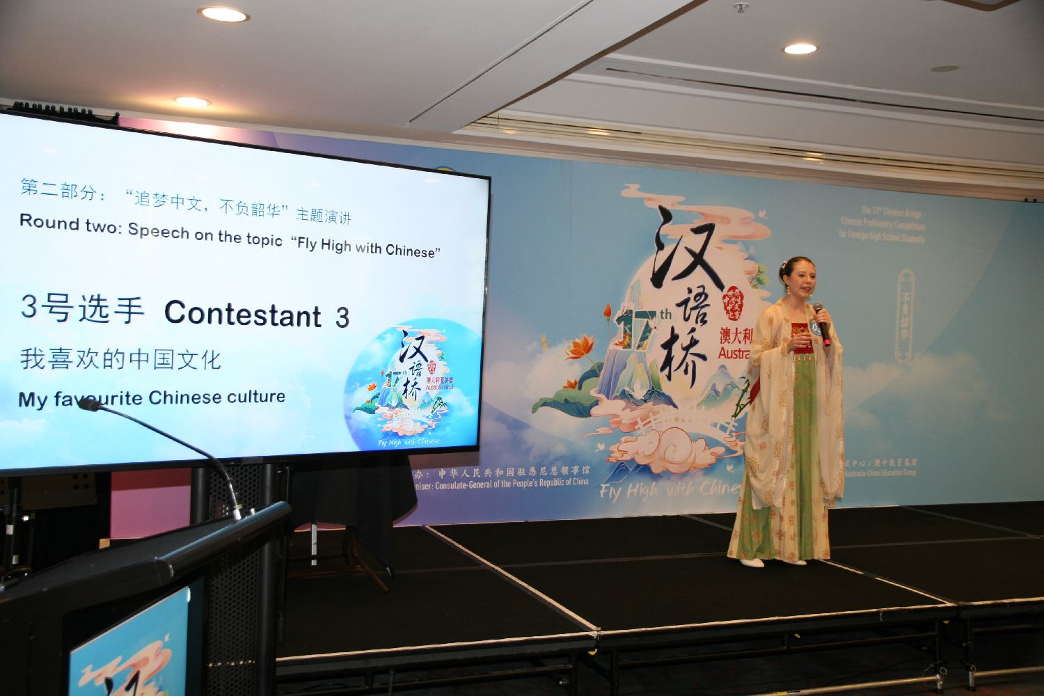 当地时间5月26日,在悉尼举行的第17届“汉语桥”世界中学生中文比赛澳大利亚赛区总决赛中,参赛选手在演讲《我喜欢的中国文化》。中新社