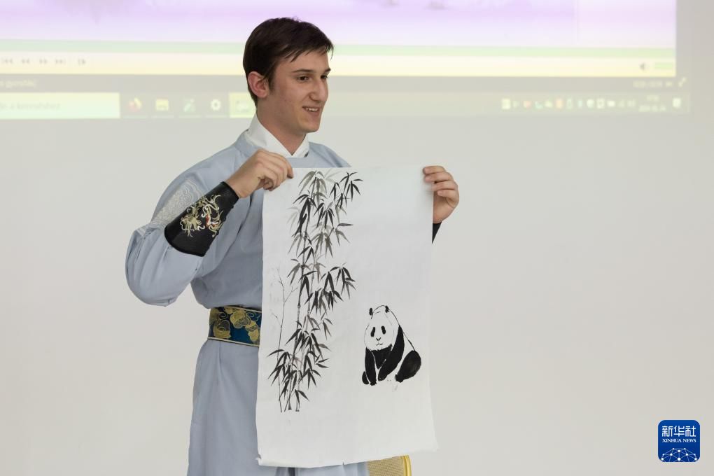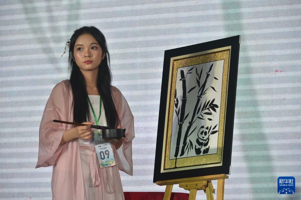 5月25日,在越南河内举行的第23届“汉语桥”世界大学生中文比赛越南北部及中部赛区决赛上,来自河内师范大学的韦氏如琼展示水墨画。新华社