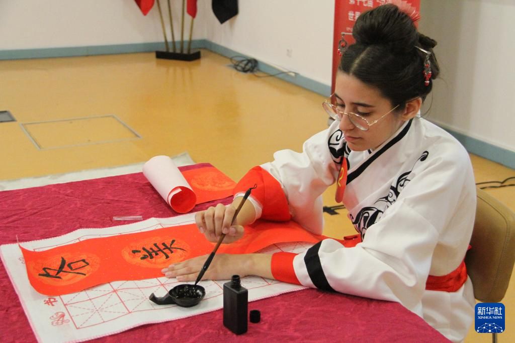 5月25日,在葡萄牙首都里斯本举行的第23届“汉语桥”世界大学生中文比赛葡萄牙赛区比赛上,参赛选手展示书法才艺。新华社
