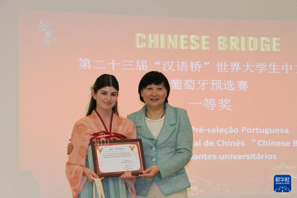 5月25日,在葡萄牙首都里斯本举行的第23届“汉语桥”世界大学生中文比赛葡萄牙赛区比赛上,参赛选手(左)获颁荣誉证书。新华社