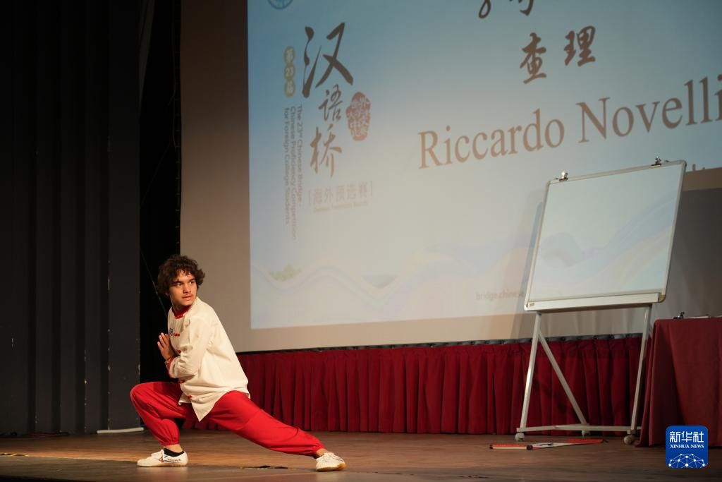 5月24日,在意大利马切拉塔大学举行的第23届“汉语桥”世界大学生中文比赛意大利暨圣马力诺赛区比赛上,参赛选手进行武术才艺展示。新华社
