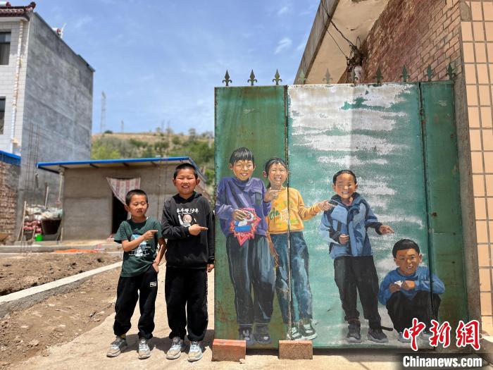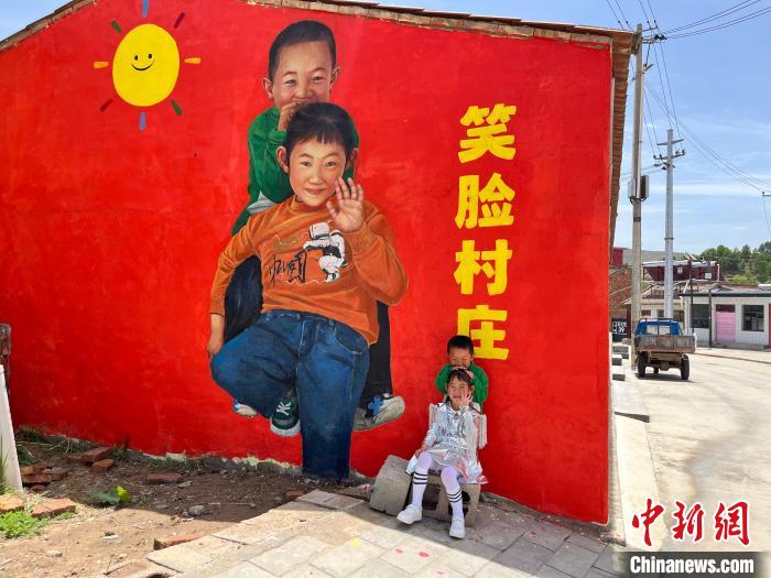 5月30日,甘肃白银市会宁县青江驿村,稚嫩孩童们的笑脸、慈眉善目的老人、馒头店的“大馒头”、电器店的“大灯泡”出现在村民家的大门、窗户、围墙上,向过往路人展示村子里浓浓的乡土乡情。近日,来自“艺术改变乡村”的公益团队在青江驿村开展艺术创作,将村民的日常生活绘至墙体上,用30多张笑脸展示乡村的精神风貌,“笑脸墙”也成为游人及村民打卡的“新天地”。图为“笑脸村庄”墙绘与被绘画的两个小朋友。