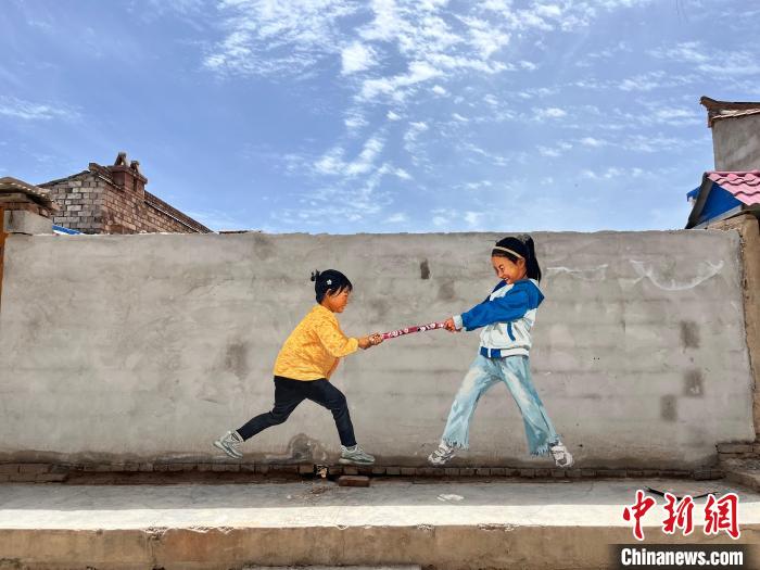 村里孩子们的打闹场景出现在村里的一方围墙上。