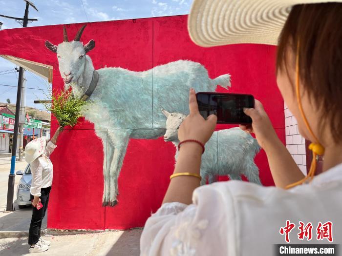 来到该村的游人在墙绘前拍照打卡。