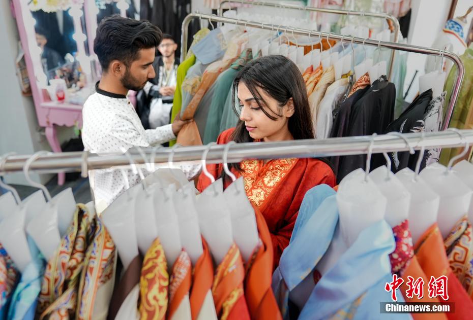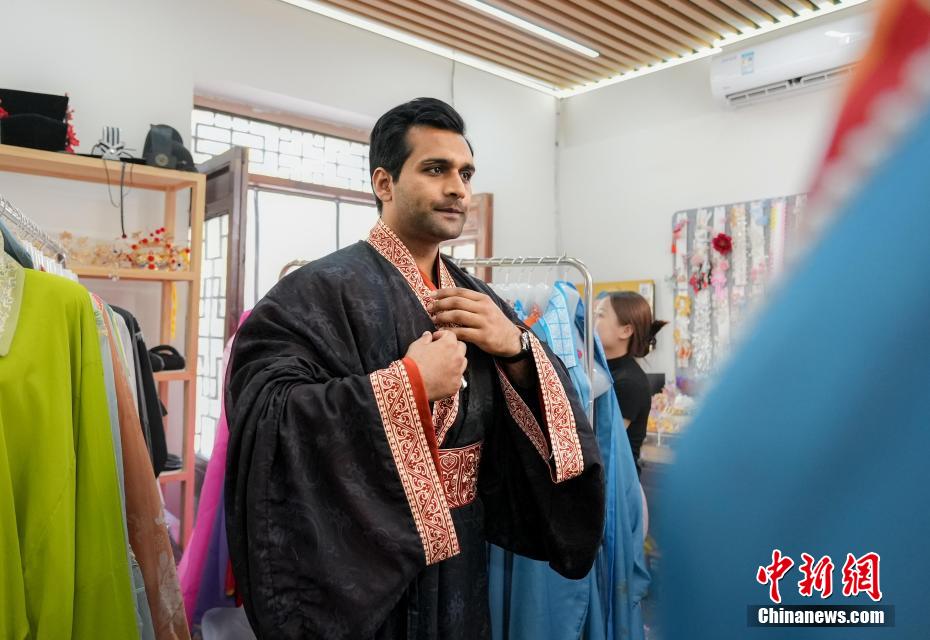 河北省邯郸市是中国历史文化名城,有着3000多年的建城史,是中国唯一一个3000年来没有改过名字的城市。邯森(Syed Ali Hassan)、苏曼(Shakeel Suman)、穆贝德(Ubaid Muhammad)和阿伟(Afzal Muhammad Asyab)来自巴基斯坦,目前就读于河北工程大学。近日,4人相约登“武灵丛台”,身穿战国袍漫步回车巷,与千年古城邯郸来了一次亲密接触。图为邯森试穿汉服。