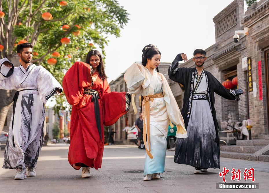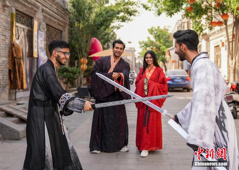 邯森等4名巴基斯坦留学生在回车巷历史文化街区穿汉服,“切磋”武艺,感受中国传统文化。